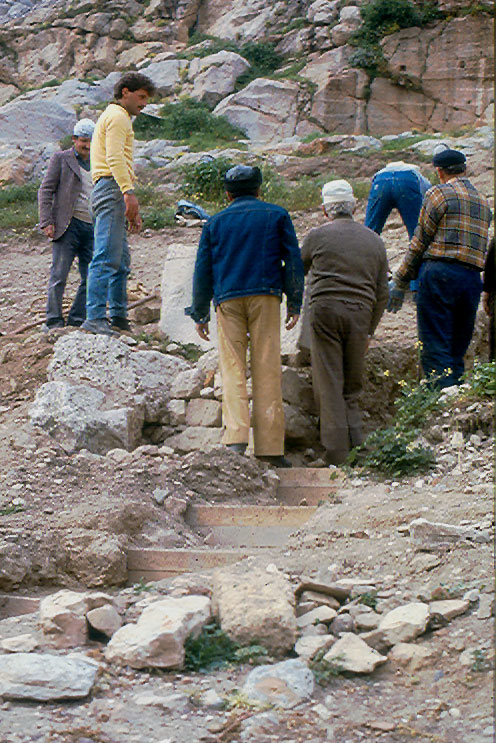 Η αποκατάσταση του αναλημματικού τοίχου της ανατολικής παρόδου ήταν το πρώτο και κύριο έργο στο οποίο επιικεντρώθηκαν οι δραστηριότητες της Επιτροπής, ξεκινώντας από την πρόσληψη της αρχιτέκτονος Ελένης Μακρή για την εκπόνηση της σχετικής μελέτης. Η μελέτη ολοκληρώθηκε, αφού προηγήθηκε και ανασκαφική έρευνα, εσωτερικά από το ανάλημμα, υπό τον υποδιευθυντή της Εφορείας, Κωνσταντίνο Τσάκο. Μετά την αποχώρηση της Μακρή από την Ελλάδα, η μελέτη υλοποιήθηκε από την αρχιτέκτονα Αθηνά Σαμαρά.