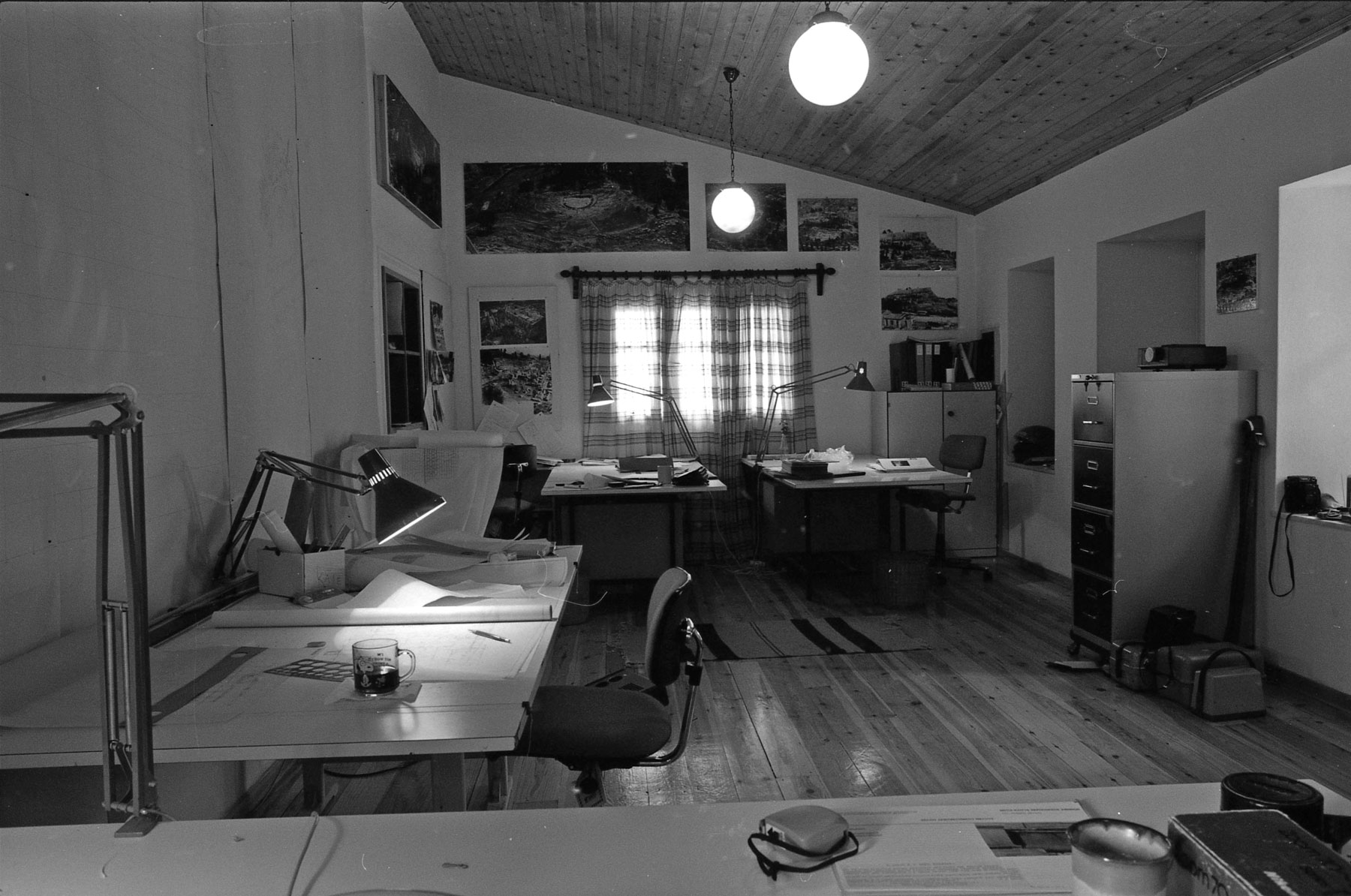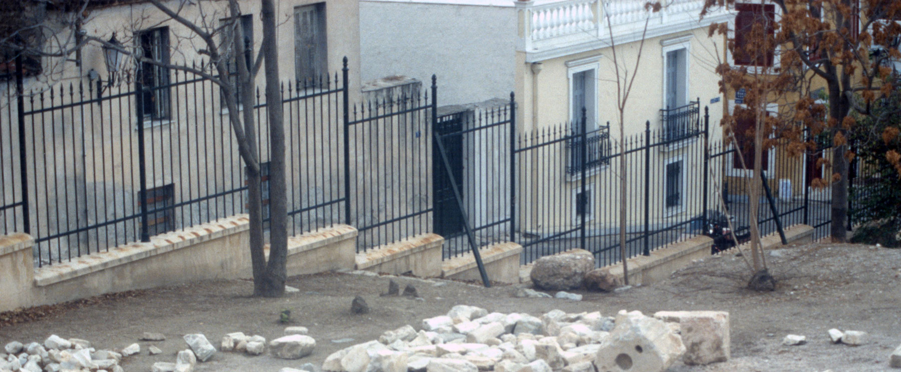 Για να αντιμετωπιστεί η έλλειψη απαραίτητων χώρων ανακαινίστηκε το σπίτι στο βάθος της αυλής της οδού Θρασύλλου 20 (σημ. 32). Έτσι, πάντα με εργασίες του προσωπικού της Εφορείας, στο ισόγειο στεγάστηκαν τα γραφεία της Επιτροπής (εικ. 24), ενώ το υπόγειο έγινε αρχαιολογική αποθήκη, όπου συγκεντρώθηκαν για φύλαξη αρχαία μικρού μεγέθους, προερχόμενα από περισυλλογή στην επιφάνεια του αρχαιολογικού χώρου (σημ. 33) (εικ. 25). Όταν αποφασίστηκε η αντικατάσταση της παλιάς συρμάτινης περίφραξης του αρχαιολογικού χώρου, με καγκελόφραξη ανταποκρινόμενη, στο μέτρο του δυνατού, στα μνημεία που περικλείει, αντί για ανάθεση σε εργολαβική εταιρεία δημιουργήθηκε σιδηρουργείο στην αυλή της Θρασύλλου 20. Παραγγέλθηκαν τα υλικά στις επιθυμητές διαστάσεις και συνδέθηκαν με οξυγονοκόλληση και πριτσίνια, σύμφωνα με σχέδιο εμπνευσμένο από τις χαρακτηριστικές περιφράξεις δημόσιων χώρων των Αθηνών. Παράλληλα κατασκευαζόταν και το τοιχίο στην οδό Θρασύλλου (σημ. 34), επί του οποίου πακτώνονταν σταδιακά οι ορθοστάτες με τις φλογόσχημες απολήξεις από σίδερο και τις κωδωνοειδείς βάσεις από μολύβι, ενώ στα μεταξύ τους διαστήματα τοποθετούνταν έτοιμες, συνδεδεμένες μεταξύ τους οι σιδερένιες βέργες με τις λογχοειδείς απολήξεις και τις με ροζέτες καταλήξεις· τα δύο τελευταία από αλουμίνιο (εικ. 26, 27). Αυτή η «χειροποίητη» κατασκευή κρίθηκε ως καταλληλότερη, ωραιότερη και μακράν οικονομικότερη, αφού το κόστος της αφορούσε μόνο τα υλικά. Η περίφραξη στην οδό Θρασύλλου θα αποτελούσε και το πιλοτικό πρόγραμμα για τη συνέχεια του έργου στη λεωφόρο Διονυσίου Αρεοπαγίτου. Η εφαρμογή ξεκίνησε από το υψηλότερο τμήμα της Θρασύλλου (σημ. 35), από την αυτονόητη είσοδο δηλαδή του εργοταξίου, και σταμάτησε μερικά μέτρα πριν από την γωνία με τη Διονυσίου Αρεαπαγίτου, γιατί είχε προταθεί (εικ. 28), ανεξάρτητα από την προοπτική πεζοδρόμησης της Διονυσίου Αρεοπαγίτου, η αντικατάσταση της κεντρικής εισόδου στον αρχαιολογικό χώρο, στη νοτιοανατολική γωνία του (σημ. 36). Για να γίνει ευκολότερα προσιτός ο χώρος των κλιτύων της Ακρόπολης από την περιοχή της Πλάκας, είχε προταθεί και η ενεργοποίηση παλαιότερων εισόδων περιμετρικά του λόφου (εικ. 29) (σημ. 37).