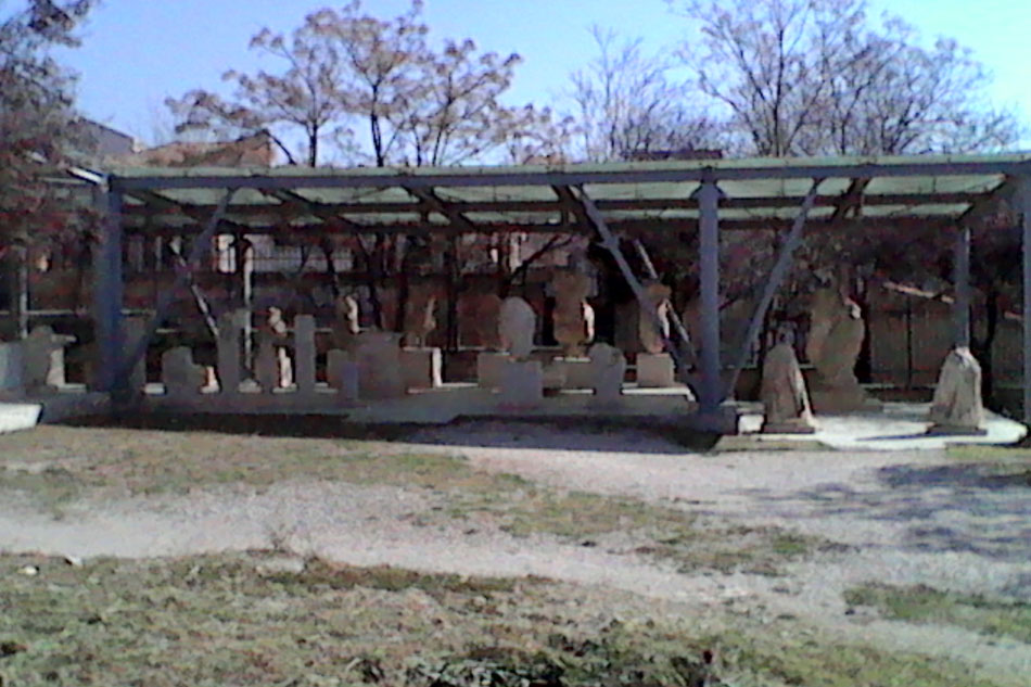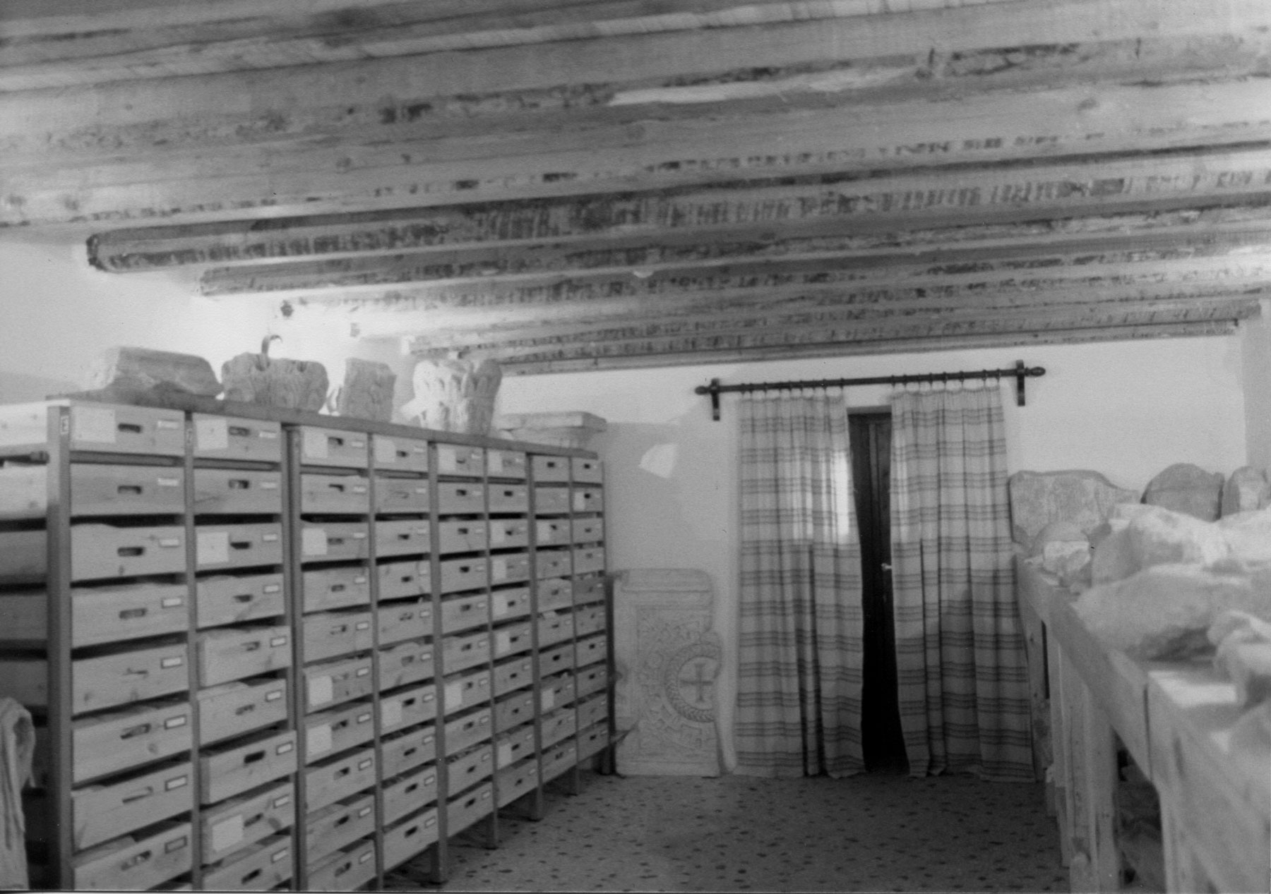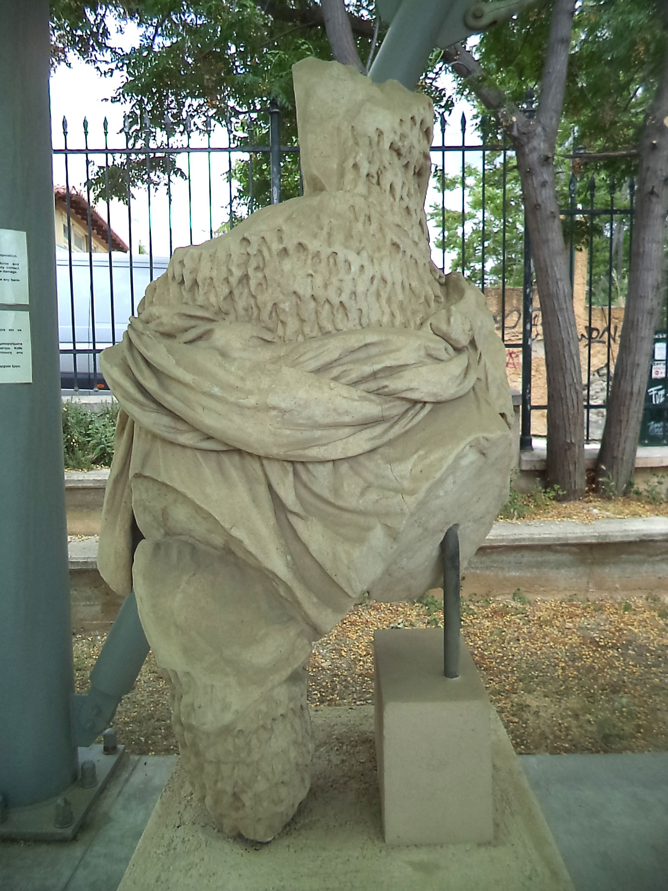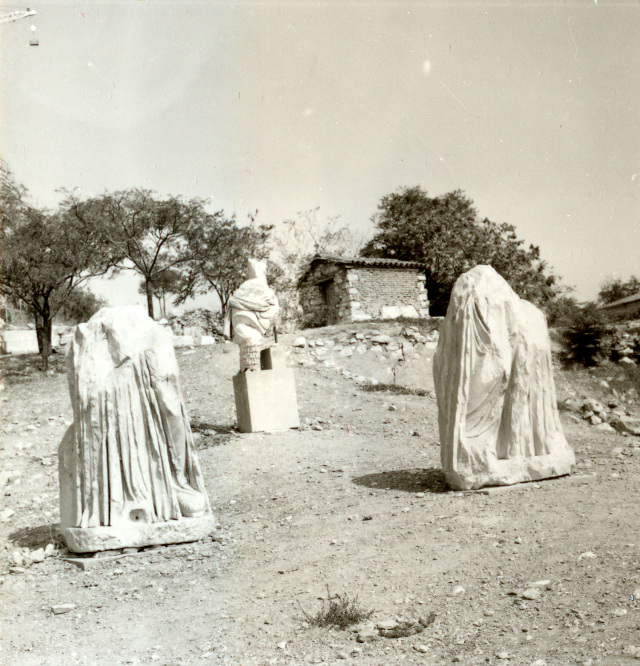 Στο πλαίσιο τακτοποίησης του αρχαιολογικού χώρου, ένα μικρό αλλά σημαντικό έργο ήταν η δημιουργία αποθήκης-έκθεσης των διάσπαρτων ελληνιστικών και ρωμαϊκών αγαλμάτων, ανάγλυφων απεικονίσεων και ενεπίγραφων βάσεων, όπως αυτή με το όνομα ΜΕΝΑΝΔΡΟΣ, που προέρχονταν κυρίως από τις ανασκαφές του 19ου αιώνα. Έτσι προκρίθηκε μία από τις τρεις θέσεις που είχαν προταθεί παλαιότερα από τον Wurster, στην περισσότερο απόμακρη θέση του αρχαιολογικού χώρου, στη νοτιοανατολική γωνία του, όπου δεν είχαν εντοπιστεί οικοδομικά κατάλοιπα καμίας εποχής (εικ. 30), γιατί η έστω και στο ελάχιστο καταστροφή αρχαίου μνημείου θα ήταν έργο κραυγαλέα αντιεπιστημονικό. Το στέγαστρο (σημ. 38) έπρεπε να είναι μικρό (100 τ.μ.) και διακριτικό επειδή θα ήταν ορατό από την περιοχή του ωδείου του Περικλή, το επιθέατρο και, από ψηλότερα, το τείχος της Ακρόπολης (σημ. 39). Τα υποστυλώματα του στεγάστρου ήταν ξύλινα και η στέγασή του τετράρριχτη για να αποφευθεί η δημιουργία πρόσθετων όγκων (εικ. 31-36). Συγχρόνως, βρέθηκαν κεραμίδια ωχροκίτρινου πηλού, έτσι ώστε η στέγη να είναι όσο το δυνατόν διακριτικότερη.
