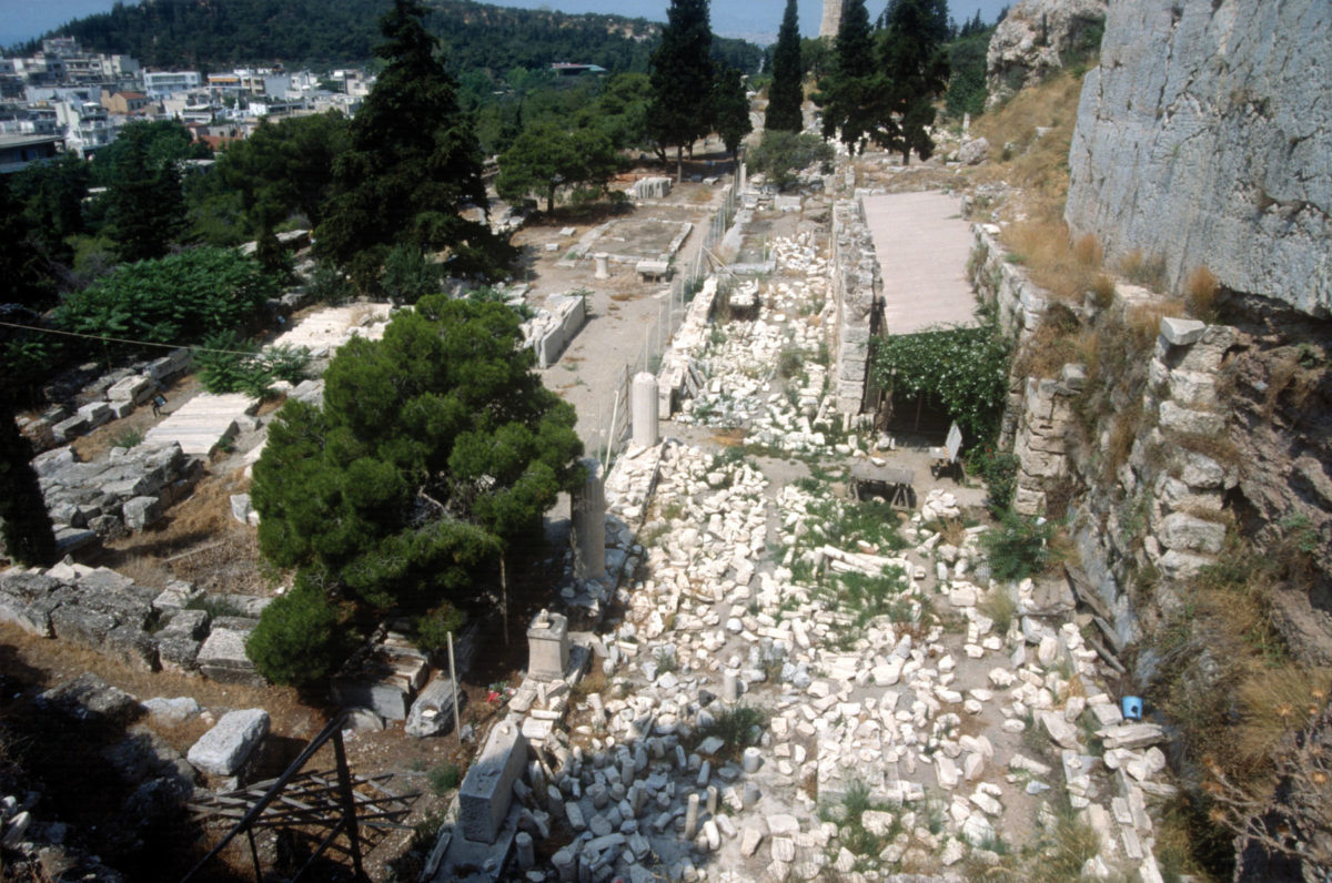 Μετά την αφαίρεση του τεράστιου όγκου των επιχώσεων, των προερχόμενων από την κατεδάφιση των σπιτιών του τουρκικού οικισμού από το πλάτωμα της Ακρόπολης, το πρώτο μεγάλο έργο στη Νότια Κλιτύ της Ακρόπολης ήταν η αποκάλυψη του Θεάτρου του Διονύσου (σημ. 30). Στο Θέατρο και το ιερό του Διονύσου, οι καθαρισμοί και οι έρευνες συνεχίστηκαν με τον Στέφανο Κουμανούδη (1876-1879), ενώ η θεμελιώδης μελέτη πραγματοποιήθηκε από τους Dörpfeld και Reish. Ακολούθησε το 1877 η κατεδάφιση του οχυρωματικού τοίχου Σερπεντζέ. Θα ζούσαν ίσως ακόμα Αθηναίοι που είχαν υπερασπιστεί το Κάστρο από την πολιορκία του Κιουταχή και είχαν ζήσει τις ανελέητες μάχες στις οποίες θα χάθηκαν σύντροφοί τους. Φαίνεται η χαρά που έφυγε ο Σερπεντζές, αυτή η «μέγκενη» στα νοτιοδυτικά του Ιερού Λόφου, στην αναφορά της κατεδάφισης: «ακώλυτον έχουμεν [πλέον] την θαυμασίαν θέαν της πεδιάδος, των λόφων, της φαληρικής αμαξιτού, της θαλάσσης και των νήσων… [Επιπλέον] προέκυψαν αρχιτεκτονικά μέλη και… πολλά θραύσματα» (σημ. 31).