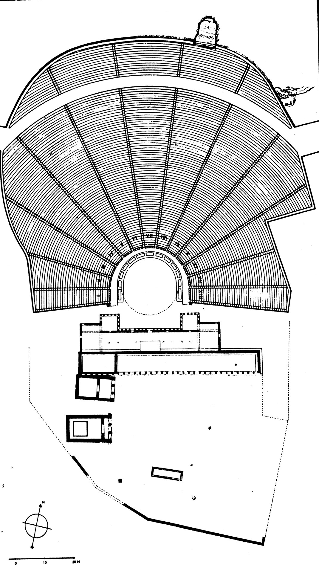 Το κοίλο είναι το πιο εκτεταμένο και χαρακτηριστικό τμήμα του κλασικού Θεάτρου (σημ. 20) (εικ. 5, 6). Αμέσως μετά την αφαίρεση των πευκοκυπάρισσων από το χώρο του (εικ. 7-10) και την αποκάλυψη της ανώμαλης χωμάτινης επιφάνειάς του ξεκίνησε το έργο ομαλοποίησής της (εικ. 11-14) (σημ. 21), με στόχο κατ’ αρχάς την επαναφορά της εικόνας που είχε στις αρχές του 20ού αιώνα, όπως δηλαδή το είχαν αφήσει οι ανασκαφείς που το αποκάλυψαν και το μελέτησαν (1862-67) (σημ. 22) (εικ. 15). Από τη μελέτη του κοίλου αποδείχτηκε ότι δεν υπήρχε δεύτερο διάζωμα. Στο εξ ορισμού αναστρέψιμο πρόγραμμα αποκατάστασης της μορφής του κοίλου, εντασσόταν και η διαμόρφωση των 13 κερκίδων (Ι-ΧΙΙΙ), δηλαδή των 14 (σημ. 23) κλιμάκων που τις ορίζουν, καθώς και η επανάκτηση, με χωματουργικές εργασίες, της μορφής του διαζώματος (σημ. 24). Είναι γνωστό ήδη από τις ανασκαφές του 19ου αιώνα ότι η συντριπτική πλειονότητα των εδωλίων, όπως άλλωστε και των βαθμίδων των κλιμάκων, όχι απλώς δεν βρίσκεται στη θέση της, αλλά έχει χαθεί (σημ. 25). Οι χαμένες, εκτός από έξι, βαθμίδες (σημ. 26), δηλαδή πρακτικά οι ανύπαρκτες σε όλο το ύψος τους κλίμακες του κοίλου αποκαταστάθηκαν με ξύλινα ρίχτια (σημ. 27), τοποθετημένα ανά 75 εκ., στην προέκταση των σωζόμενων χαμηλότερων βαθμίδων που διατηρούνται in situ (εικ. 16).