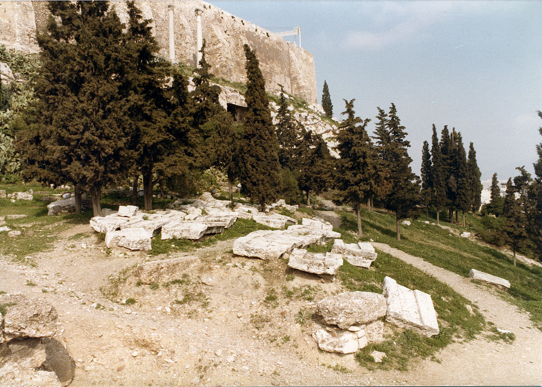 Αυτονόητα, από τη χρήση στους αρχαίους χρόνους, θα είχαν σχηματιστεί ανηφορικοί δρόμοι που θα οδηγούσαν στο ιερό του Διονύσου, το Θέατρο, τον Περίπατο και το Ασκληπιείο. Στην αρχαιολογική έρευνα όμως δεν έχουν επισημανθεί στοιχεία για την ύπαρξή τους (σημ. 41), εκτός από την εφαπτόμενη στον δυτικό αναλημματικό τοίχο του κοίλου αναβάθρα (σημ. 42). Οι άλλοι δρόμοι που οδηγούσαν στα μνημεία της Νότιας Κλιτύος ή ήταν χωματόδρομοι ή, αν ήταν λιθοστρωμένοι, στο πέρασμα των αιώνων αχρηστεύθηκαν και οι λίθοι τους χρησιμοποιήθηκαν σε άλλες κατασκευές. Επομένως, όπως έχει ειπωθεί (σημ. 43), η περίμετρος του περιβόλου του ιερού του Διονύσου, τα όρια του ωδείου του Περικλή και των χορηγικών μνημείων, μας επιτρέπουν απλώς να υποθέσουμε τη διαδρομή ορισμένων αρχαίων δρόμων. Με την έλλειψη όμως των σχετικών τεκμηρίων, οι πλατείς και μάλιστα τσιμεντοστρωμένοι (!) δρόμοι, που εξέχουν έντονα από το έδαφος, με τις διασταυρώσεις τους μπορεί να χαρακτηριστούν ως αυθαίρετο έργο, αφού δημιουργούν ένα παραπειστικό ογκώδες στοιχείο, ξένο από τις αρχές που διέπουν τα έργα προστασίας και συντήρησης και ασφαλώς αταίριαστο με τα αρχαία της Νότιας Κλιτύος, ενός δηλαδή από τους σημαντικότερους αρχαιολογικούς χώρους του δυτικού πολιτισμού (σημ. 44). Η χρήση σύγχρονων υλικών, π.χ. τσιμέντου και μετάλλων, εξ ορισμού δεν εντάσσεται στη λογική συντήρησης του αρχαίου ως έχει. Το «γυμνό τσιμέντο» στα πεζούλια και τους αναλημματικούς τοίχους, εκτός από τη δημιουργία όγκων που δεν υπήρχαν στην αρχαιότητα, κατηγορηματκά δεν συνάδει με τις αρχές της συντήρησης και ανάδειξης των μνημείων. Ακριβώς όπως δεν είναι επιτρεπτή η επικάλυψη με τσιμέντο αρχαίων λιθοπλίνθων.