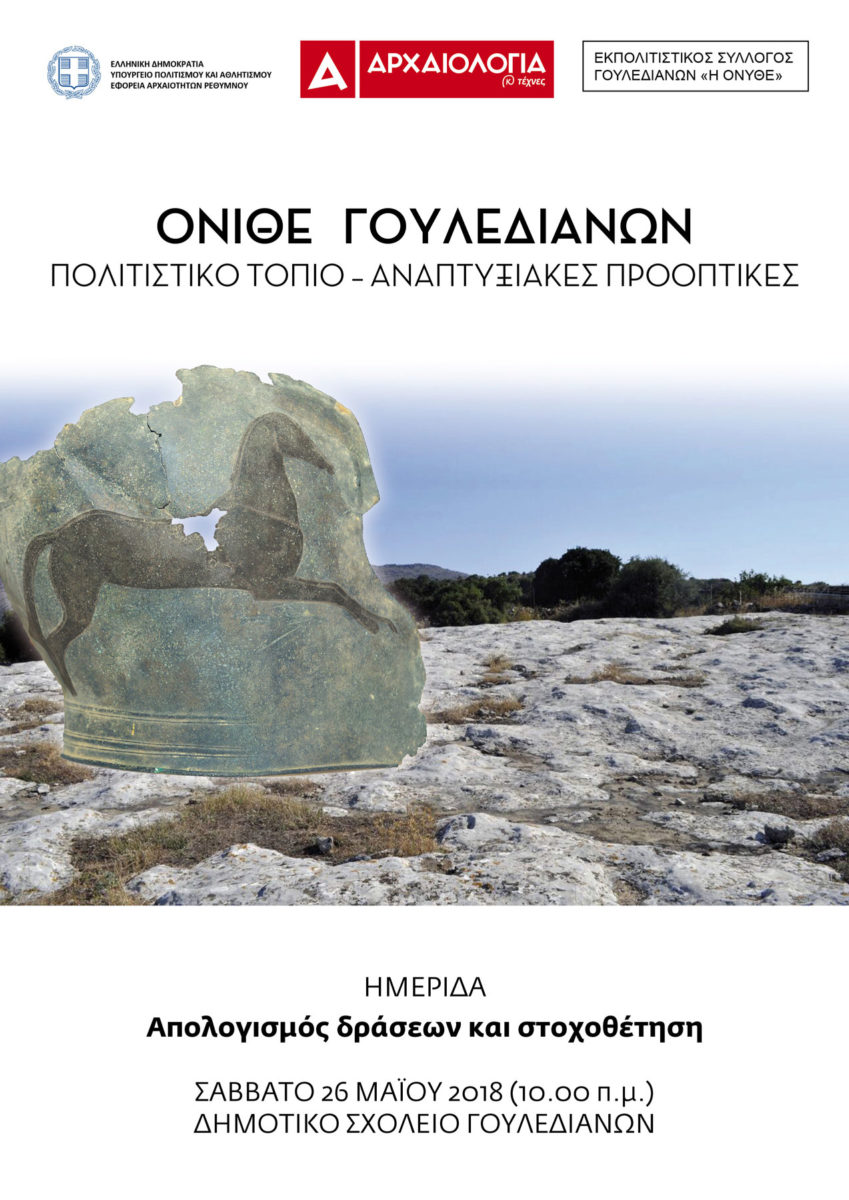 Το Σάββατο 26 Μαΐου 2018 θα πραγματοποιηθεί στα Γουλεδιανά Ρεθύμνου η 3η Συνάντηση για την Πολιτιστική Ανάπτυξη της Ονιθές. Η εκδήλωση με τίτλο «Ονιθέ Γουλεδιανών –Πολιτιστικό Τοπίο – Αναπτυξιακές Προοπτικές (Απολογισμός Δράσεων και Στοχοθέτηση) συνδιοργανώνεται από την Εφορεία Αρχαιοτήτων Ρεθύμνου, το περιοδικό «Αρχαιολογία και Τέχνες» και τον Εκπολιτιστικό Σύλλογο Γουλεδιανών. Η ώρα έναρξης της εκδήλωσης-ημερίδας έχει οριστεί στις 10.00 π.μ. και θα πραγματοποιηθεί στο χώρο του παλαιού Δημοτικού Σχολείου Γουλεδιανών.