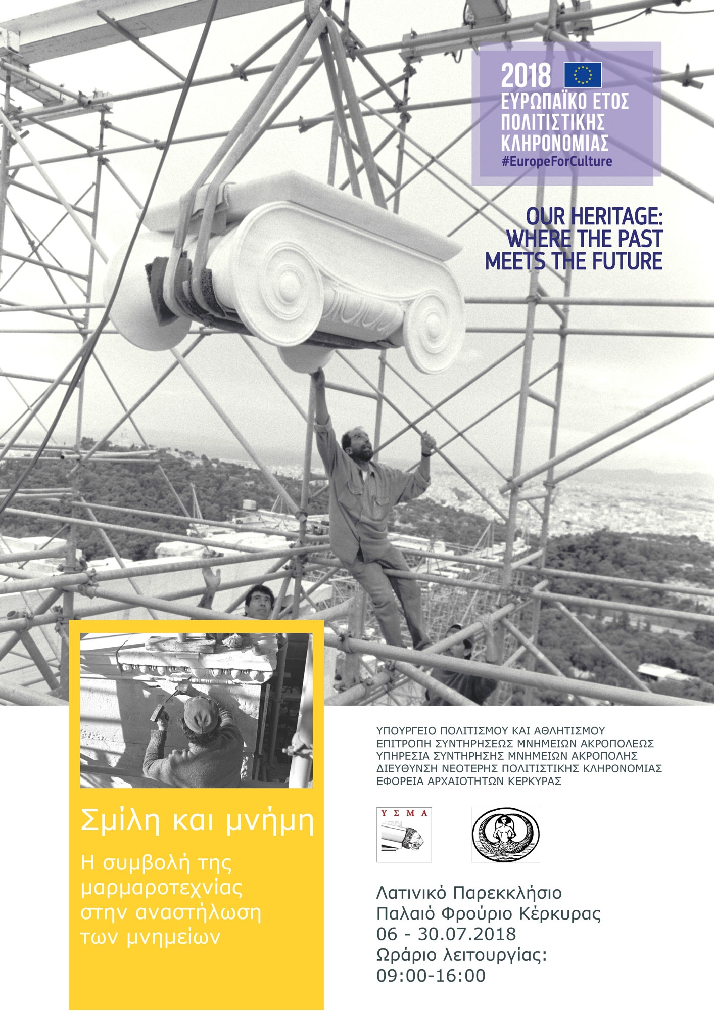 Mε την έκθεση φωτογραφίας «Σμίλη και μνήμη. Η συμβολή της μαρμαροτεχνίας στην αναστήλωση των μνημείων» συμμετέχουν η Επιτροπή Συντηρήσεως Μνημείων Ακροπόλεως (ΕΣΜΑ), η Υπηρεσία Συντήρησης Μνημείων Ακρόπολης (ΥΣΜΑ) και η Διεύθυνση Νεότερης Πολιτιστικής Κληρονομιάς (ΔΙΝΕΠΟΚ) στον εορτασμό του Ευρωπαϊκού Έτους Πολιτιστικής Κληρονομιάς 2018. Πρώτος σταθμός της έκθεσης, που θα περιοδεύσει στην Ελλάδα, θα είναι, μετά από πρόσκληση της Εφορείας Αρχαιοτήτων Κέρκυρας, το Λατινικό Παρεκκλήσιο, στο Παλαιό Φρούριο Κέρκυρας. Τα εγκαίνια θα γίνουν την Παρασκευή 6 Ιουλίου, στις 8:00 μ.μ. Στην έκθεση, που θα διαρκέσει έως τις 30 Ιουλίου 2018, παρουσιάζεται αρχειακό υλικό από το Έργο αποκατάστασης των μνημείων της Ακρόπολης, με κεντρικό θεματικό άξονα τη συμβολή του ανθρώπινου παράγοντα στο αναστηλωτικό έργο.