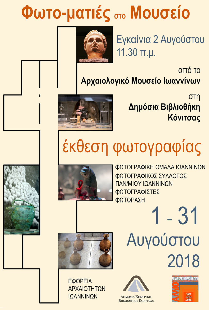 Ομαδική έκθεση φωτογραφίας με τίτλο «Φωτο-ματιές στο Μουσείο» θα εγκαινιαστεί στη Δημόσια Βιβλιοθήκη Κόνιτσας την Πέμπτη 2 Αυγούστου 2018, και ώρα 11:30. Η έκθεση ταξιδεύει από το Αρχαιολογικό Μουσείο Ιωαννίνων, όπου πρωτοπαρουσιάστηκε τον περασμένο Μάιο, στη Δημόσια Κεντρική Βιβλιοθήκη της Κόνιτσας, όπου θα φιλοξενηθεί έως τις 31 Αυγούστου 2018.