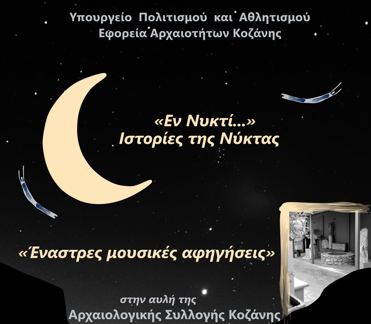 Εκδήλωση με τίτλο «Έναστρες μουσικές αφηγήσεις» διοργανώνει η Εφορεία Αρχαιοτήτων Κοζάνης στο πλαίσιο των εκδηλώσεων «Εν νυκτί…», με θεματική τις ιστορίες της νύκτας, που διοργανώνει από τις 28 Ιουλίου έως τις 11 Αυγούστου 2018 το ΥΠΠΟΑ.