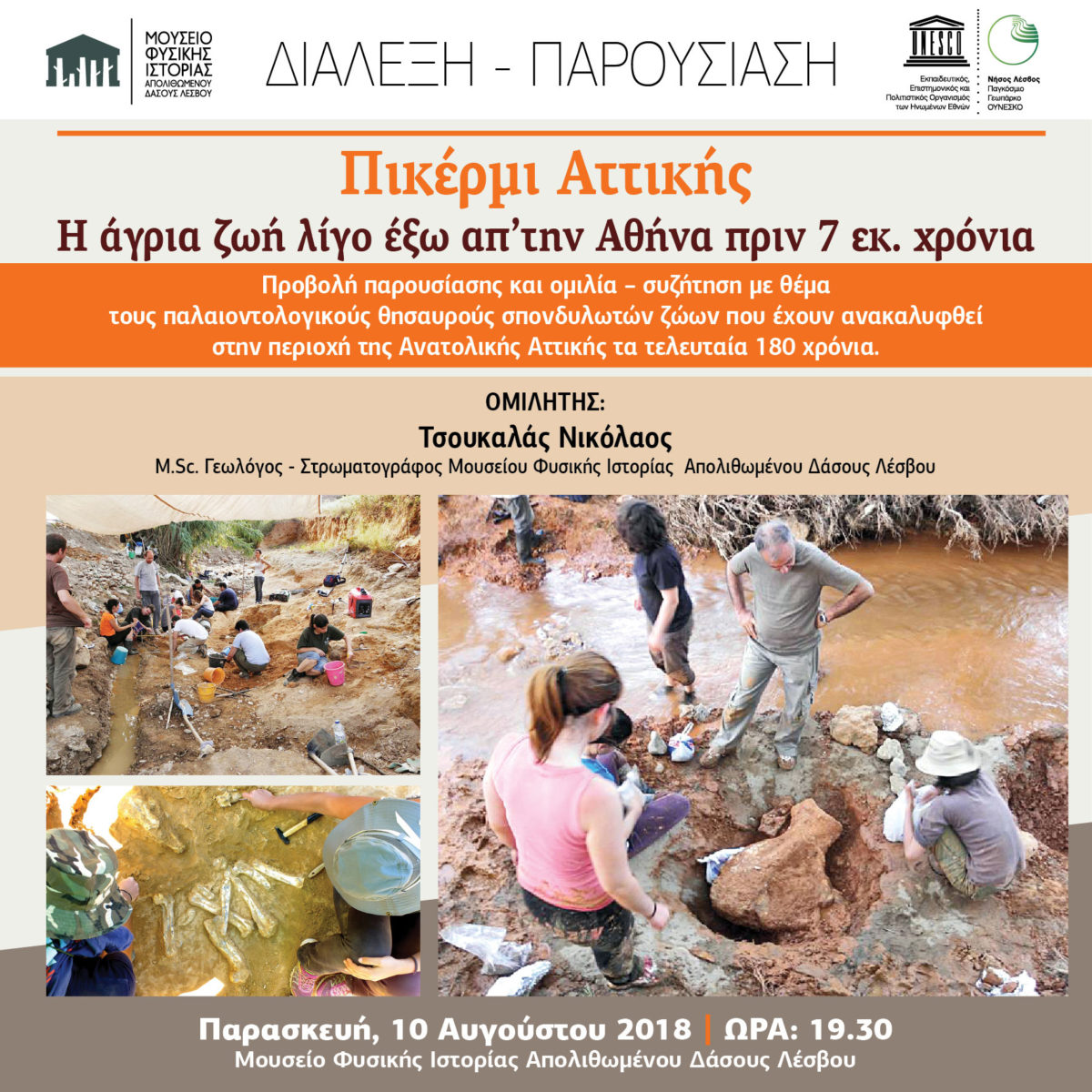 Μια εξαιρετικά ενδιαφέρουσα διάλεξη, παρουσίαση και συζήτηση για την άγρια ζωή και την ποικιλία των ζώων που έζησαν στην περιοχή του Πικερμίου, θα πραγματοποιηθεί από τον κ. Νικόλαο Τσουκαλά, MSc Γεωλόγο-Στρωματογράφο του Μουσείου Φυσικής Ιστορίας Απολιθωμένου Δάσους Λέσβου, Υπ. Διδάκτωρ Παλαιοντολογίας ΕΚΠΑ, την Παρασκευή 10 Αυγούστου και ώρα 19:30, στις εγκαταστάσεις του Μουσείου στο Σίγρι.