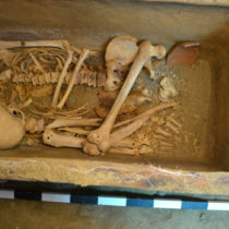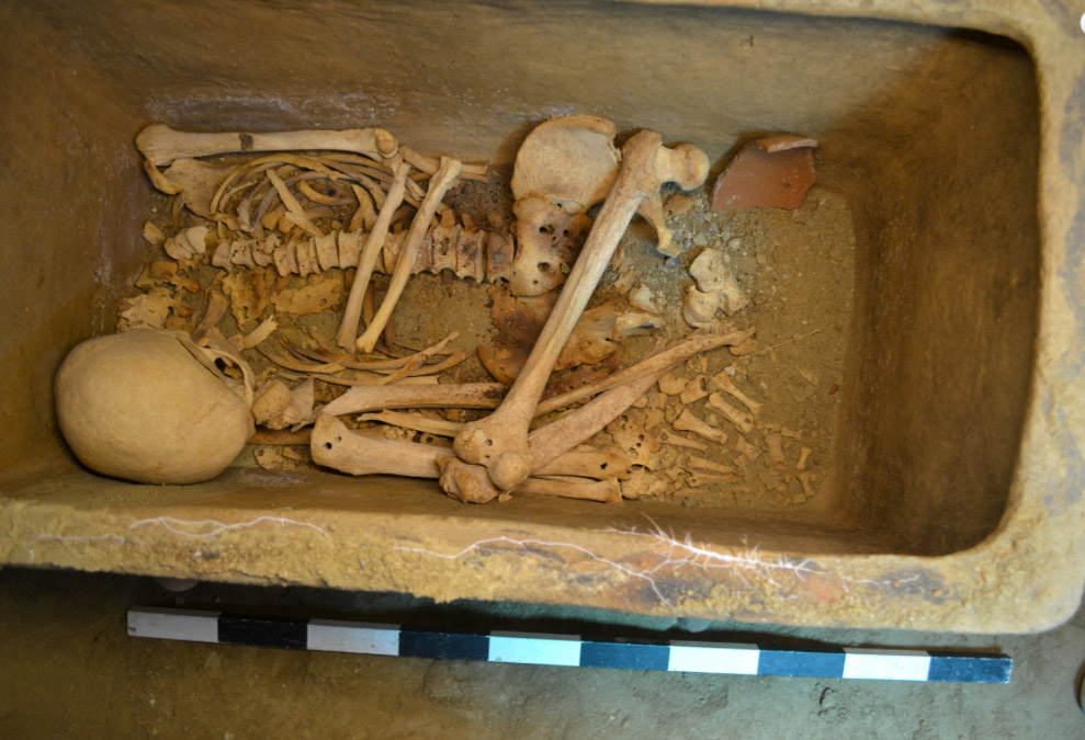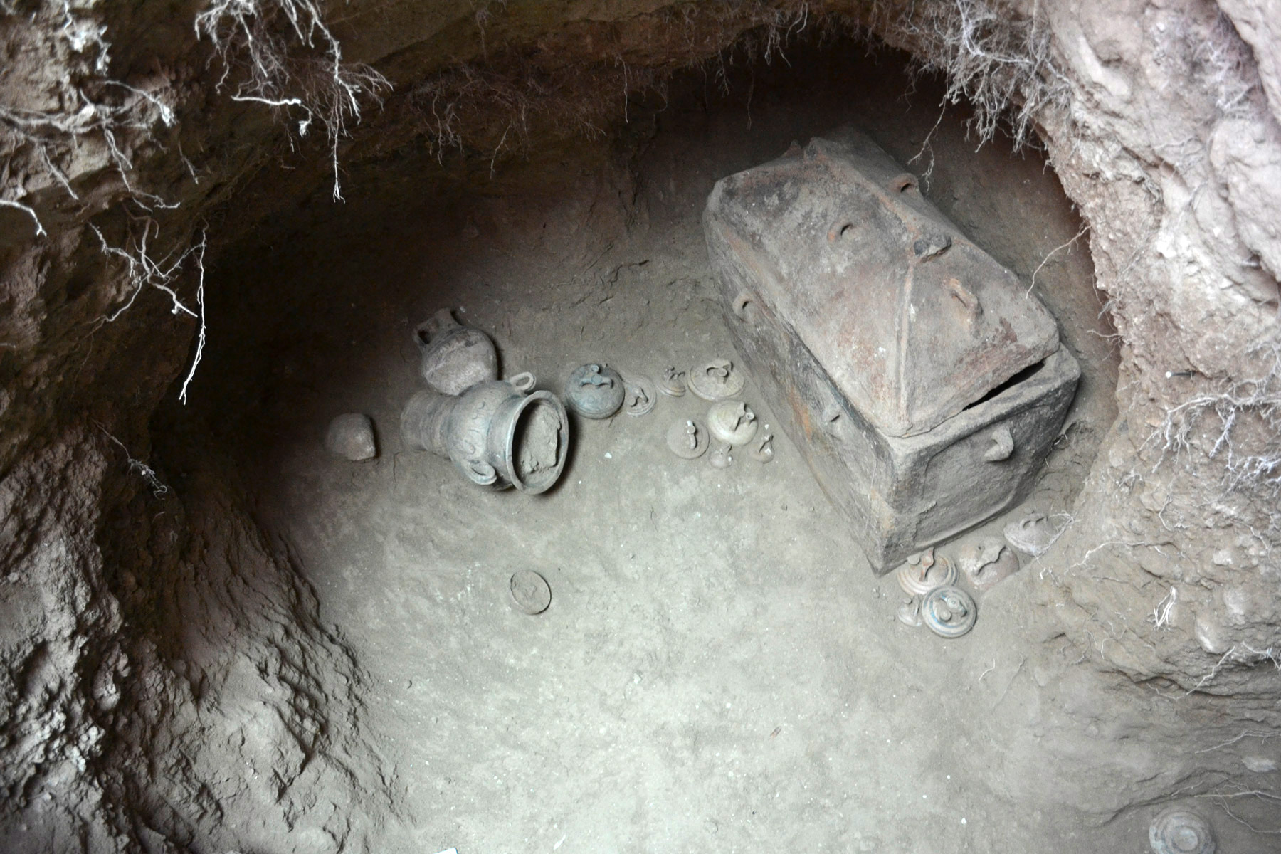 Το εσωτερικό του τάφου χωριζόταν σε τρεις λαξευμένες κόγχες. Στη νοτιότερη βρέθηκε μια ακέραιη κιβωτιόσχημη λάρνακα με το κάλυμμα στη θέση του. Στο εσωτερικό της υπήρχε ο πολύ καλά σωζόμενος σκελετός ενός ενήλικου ατόμου σε ισχυρά συνεσταλμένη στάση. Στο χώρο μπροστά από τη λάρνακα βρέθηκαν 14 ψευδόστομοι αμφορείς, ένας αμφοροειδής κρατήρας με συμφυές υποστατό και ένα κύπελλο.