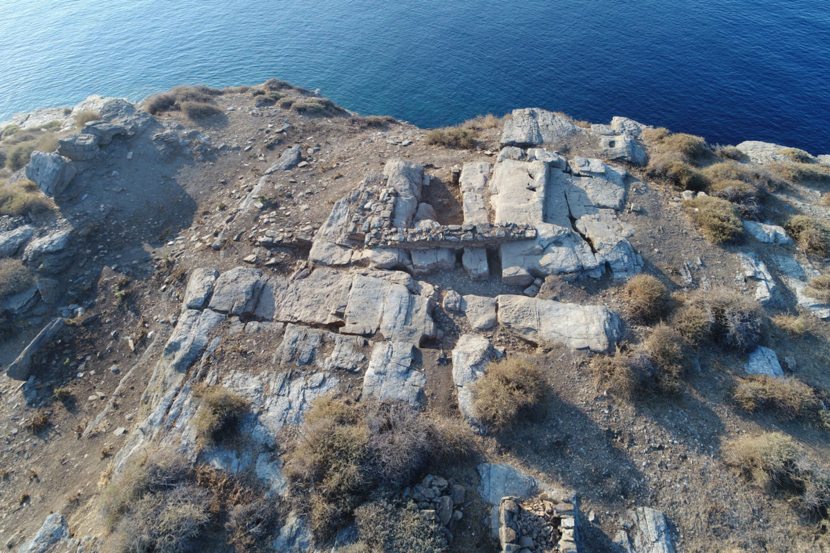 Τέλος, στο νότιο πλάτωμα της βραχονησίδας, 23 μ. ψηλότερα από τη στάθμη της θάλασσας, παρατηρήθηκαν δεκάδες ορθογώνιοι χώροι, εν μέρει λαξευμένοι στον φυσικό βράχο, ορισμένοι από τους οποίους φαίνεται ότι ήταν ημιυπαίθριοι. Φέτος ερευνήθηκαν τέσσερις από αυτούς, ενώ η τελευταία περίοδος χρήσης του ενός εξ αυτών «τοποθετείται στην Ύστερη Αρχαιότητα αλλά υπάρχουν ενδείξεις και εδώ ότι η αρχική χρήση του χώρου ανάγεται σε παλαιότερη περίοδο. Μέσα στις σχισμές του φυσικού βράχου συλλέχτηκαν κεραμική και εργαλεία από οψιανό της Πρωτοκυκλαδικής περιόδου, ενώ από τις επιχώσεις προήλθε κεραμική από το τέλος της Εποχής του Χαλκού έως και τη Ρωμαϊκή. Λίγα θραύσματα πήλινων ειδωλίων των κλασικών χρόνων, καθώς και μικκύλα αγγεία, ίσως μαρτυρούν την παρουσία ενός ιερού σε άμεση γειτνίαση», πληροφορεί η ανακοίνωση.
