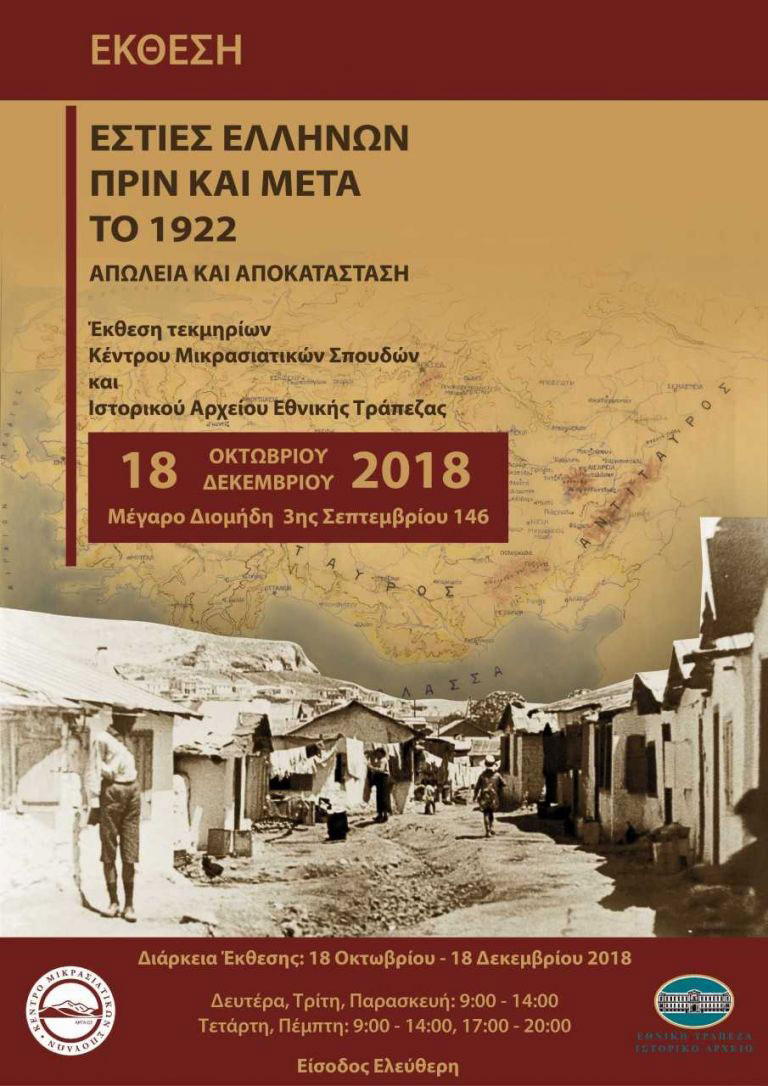 Στην έκθεση με τίτλο «Εστίες Ελλήνων πριν και μετά το 1922. Απώλεια και αποκατάσταση», παρουσιάζονται τεκμήρια από τα αρχεία και τις συλλογές του Κέντρου Μικρασιατικών Σπουδών και του Ιστορικού Αρχείου της ΕΤΕ, που αφορούν, μεταξύ άλλων, στις ελληνορθόδοξες κοινότητες στην Κωνσταντινούπολη, τη Σμύρνη, την Καππαδοκία και τον Πόντο.