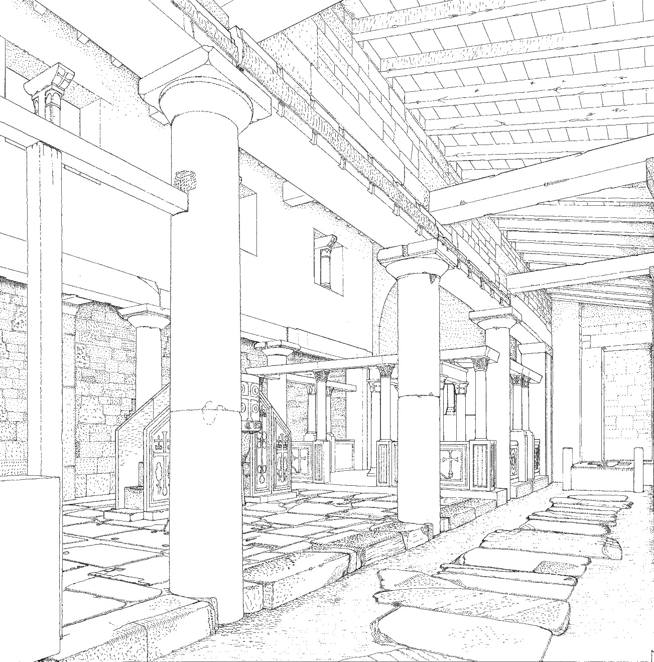 »Η λίθο προς λίθο έρευνα των καταλοίπων απεκάλυψε δύο φάσεις, κατά τις οποίες το κτήριο είχε λειτουργήσει ως χριστιανική εκκλησία, χωρίς να υποστεί ουσιώδεις οικοδομικές μετατροπές. Αρχικά (5ος αι.) απλώς τοιχίσθηκαν τα μετακιόνια της πρόσοψης πλην του πέμπτου, που κλείσθηκε με θύρα, τα θυρόφυλλα των αρχαίων θυρών αφαιρέθηκαν και κατ’ αυτόν τον τρόπο, χάρις στο μεγάλο εύρος αυτών των θυρών, ο σηκός και ο πρόναος ενώθηκαν αρκετά ικανοποιητικά. Μερικές δεκαετίες αργότερα το μεταξύ των δύο θυρών τμήμα του τοίχου κατεδαφίσθηκε, αντικατασταθέν από αξονικό πεσσό. Με αυτόν, οι ελεύθεροι πλέον σταθμοί των θυρωμάτων απάρτισαν «πολύθυρο» ή μάλλον πεσσοστοιχία, αντίστοιχη προς την εσωτερική κιονοστοιχία. Τον 6ο αιώνα ριζικές οικοδομικές επεμβάσεις μετέτρεψαν το τροποποιημένο αρχαίο κτίσμα σε τρίκλιτη βασιλική, μακρότερη, αλλά στενότερη αυτού. Τούτο συνδυάσθηκε επίσης με στροφή 90° του άξονος, ώστε αυτός να έχει κατεύθυνση από Δ προς Α. Τότε επίσης στα νότια της βασιλικής υπήρχε ένα αίθριο με μικρό περιστύλιο. Μετά την καταστροφή της βασιλικής το μέρος εγκαταλείφθηκε.