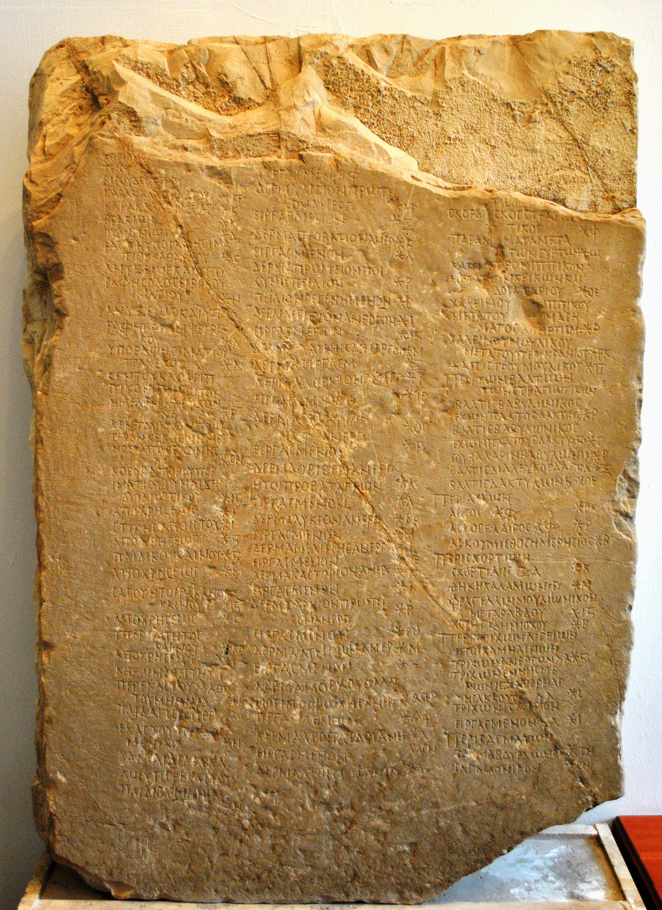 »Τοποθετημένη πλησίον της εισόδου του Μουσείου καλωσορίζει τον επισκέπτη η επιτύμβια στήλη γυναίκας, του 1ου αι. π.Χ.–1ου αι. μ.Χ., με την εμβληματική επιγραφή: Ἀρκαδία | χαῖρε. Απέναντι από το εκδοτήριο εισιτηρίων εκτίθεται ενεπίγραφη στήλη από τη Θέλπουσα, αρχαία πόλη στη βορειοδυτική Αρκαδία, η οποία διασώζει τμήμα από το περίφημο αγορανομικό διάταγμα (301 μ.Χ.) του Ρωμαίου αυτοκράτορα Διοκλητιανού με τις ανώτατες επιτρεπόμενες τιμές των προϊόντων, το οποίο κυκλοφόρησε σε όλη την αυτοκρατορία (εικ. 3).