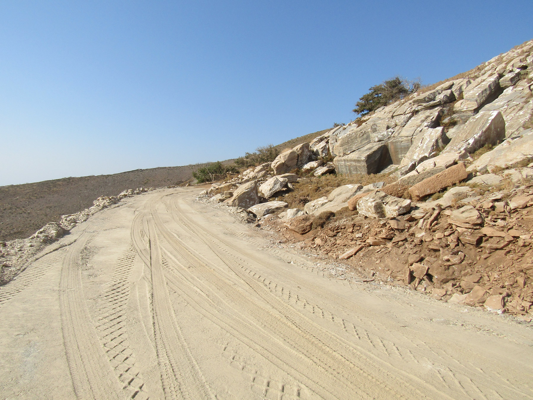 Κατά τη διάρκεια των εργασιών για τη νέα κύρια όδευση στο αιολικό πάρκο της Ανατολής της εταιρείας ΕΝΕΛ, βορειοδυτικά του οικισμού της Αμυγδαλιάς, εντοπίστηκε αρχαίο λατομείο σχιστολιθικού μαρμάρου, με δύο κύρια μέτωπα εξόρυξης, έμπροσθεν των οποίων βρίσκονται μικρές περιοχές καλυμμένες με χώμα. Το μεγαλύτερο μέτωπο εξόρυξης βρίσκεται σε μικρή απόσταση από το δεύτερο, το οποίο είναι μικρότερο σε μέγεθος και βρίσκεται σε ψηλότερο σημείο στα βορειοανατολικά του πρώτου, λαξευμένο βαθμιδωτά μέσα στον φυσικό βράχο. Στην ευρύτερη περιοχή, στα νοτιοανατολικά του μικρότερου μετώπου εξόρυξης βρίσκονται κατά χώραν αρκετοί ογκώδεις λαξευμένοι ορθογώνιοι κυβόλιθοι, διάσπαρτοι επί του φυσικού βράχου.