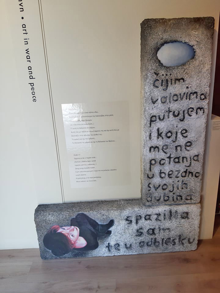 Με αυτούς τους στίχους, που περιγράφουν τον «μπλε τάφο» όπως έλεγαν οι Σέρβοι τη θάλασσα του Ιονίου, σκαλισμένους, στη σερβική γλώσσα, πάνω στο έργο της Έλενας Παπαδημητρίου, υποδέχεται τους επισκέπτες της στο Λατινικό Παρεκκλήσι του Παλαιού Φρουρίου Κέρκυρας, μία μοναδική έκθεση που διοργάνωσε η Εφορεία Αρχαιοτήτων Κέρκυρας, στο πλαίσιο του Ευρωπαϊκού Έτους Πολιτιστικής Κληρονομιάς 2018, με θέμα την παρουσία των Σέρβων στην Κέρκυρα (1916-1918) και τίτλο «Η τέχνη στον πόλεμο και στην ειρήνη».
