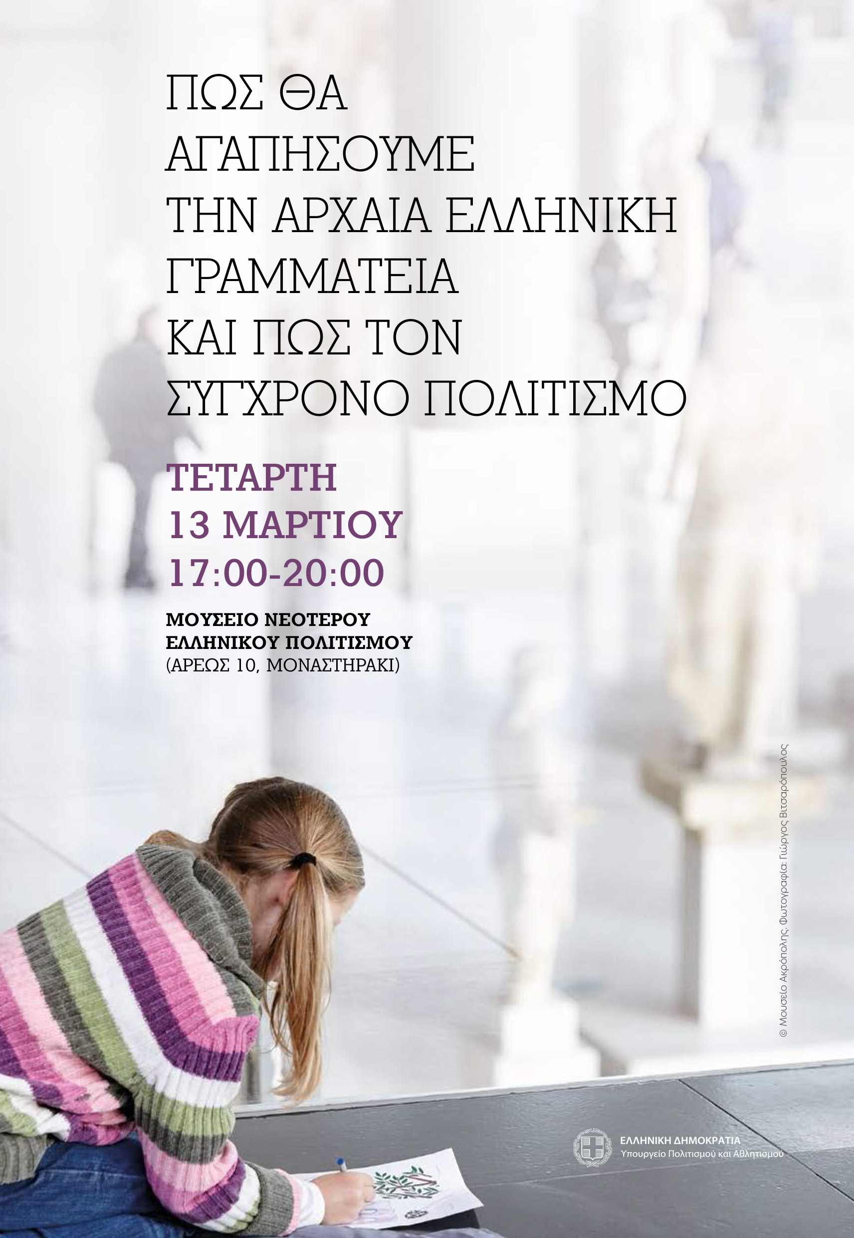 Δημόσια συζήτηση, με τίτλο «Πώς θα αγαπήσουμε την αρχαία ελληνική γραμματεία και πώς τον σύγχρονο πολιτισμό» διοργανώνει το Υπουργείο Πολιτισμού και Αθλητισμού την Τετάρτη 13 Μαρτίου και ώρα 17:00-20:00 στο Μουσείο Νεότερου Ελληνικού Πολιτισμού (Άρεως 10, Μοναστηράκι).