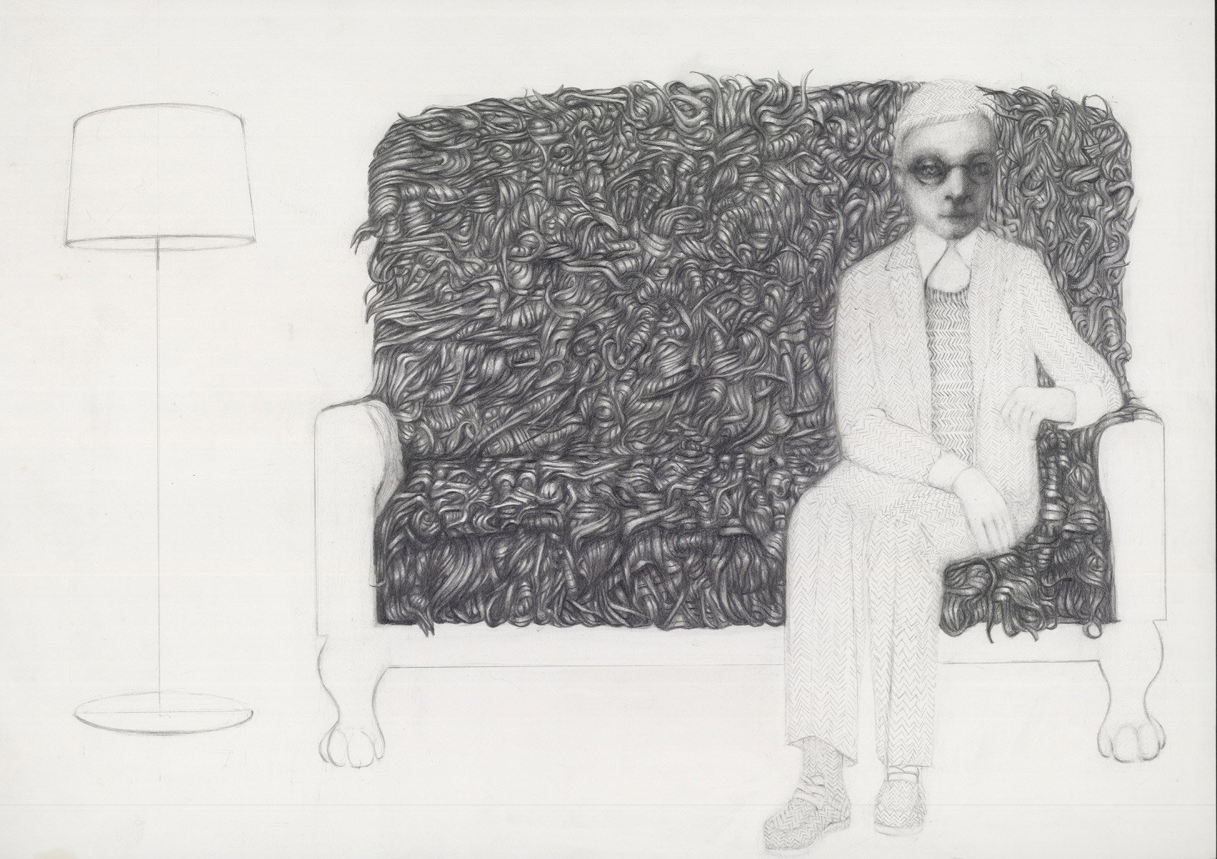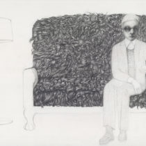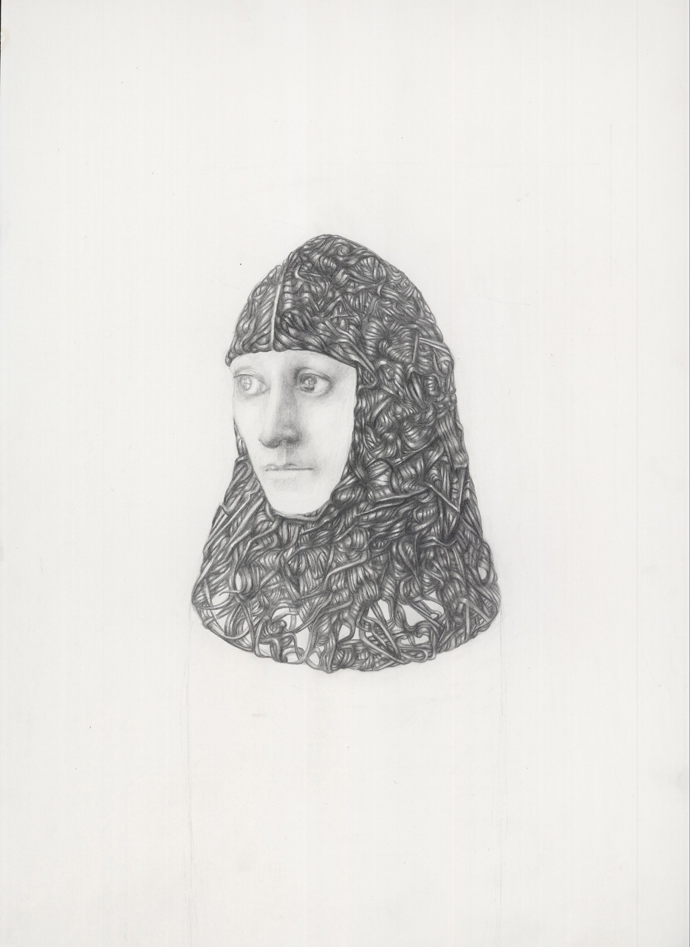 Οι εύθραυστες, ασκητικές μορφές της Ελένης Γλύνη μάς καλούν να ανακαλύψουμε τον μίτο του κόσμου της δημιουργού, έναν κόσμο δομημένο με το πιο απλό μέσο, το μολύβι, που άλλοτε μοιάζει με εργόχειρο πλεκτό και άλλοτε θυμίζει ταπισερί.