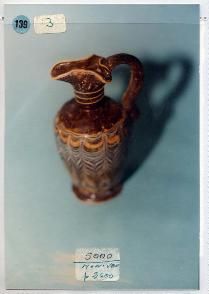 «Τον Μάρτιο του 2014 ταυτοποίησα μια αρχαία ελληνική γυάλινη οινοχόη σε κατάλογο του οίκου Christie’s, που αφορούσε δημοπρασία αρχαιοτήτων η οποία θα πραγματοποιούνταν στις 2 Απριλίου 2014 στο Λονδίνο. Η οινοχόη απεικονιζόταν σε φωτογραφία από το κατασχεθέν αρχείο του διαβόητου και καταδικασμένου για αρχαιοκαπηλία έμπορου αρχαιοτήτων Τζιάκομο Μέντιτσι (Giacomo Medici).