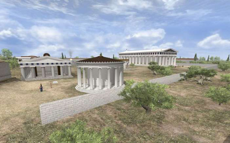 Η παραγωγή προσφέρει μια ολοκληρωμένη περιήγηση στον ιερό χώρο της αρχαίας Ολυμπίας τον 2ο αιώνα π.Χ. Μνημεία και ιερά κτήρια ζωντανεύουν, δίνοντας τη δυνατότητα στους επισκέπτες να γίνουν «κοινωνοί» των αγωνισμάτων και των τελετουργιών των Ολυμπιακών Αγώνων και να γνωρίσουν την ιστορία της πόλης: Ο ναός του Δία, υπόδειγμα δωρικού περίπτερου ναού με θαυμαστό γλυπτό διάκοσμο, το Ηραίο, το παλαιότερο μνημειακό οικοδόμημα του ιερού, αφιερωμένο στη θεά Ήρα, το Γυμνάσιο, που χρησίμευε για την προπόνηση των ακοντιστών, των δισκοβόλων και των δρομέων, η Παλαίστρα, όπου προπονούνταν οι παλαιστές, οι άλτες και οι πυγμάχοι, το Λεωνιδαίο, χώρος διαμονής των επίσημων επισκεπτών, το Βουλευτήριο, όπου αθλητές, συγγενείς και κριτές έδιναν όρκο ότι θα τηρήσουν τους κανόνες των Αγώνων, το Στάδιο, όπου τελούνταν τα περισσότερα αγωνίσματα, οι Θησαυροί διάφορων πόλεων, όπου φυλάσσονταν πολύτιμα αφιερώματα, και το Φιλιππείο, που αφιερώθηκε από τον Φίλιππο Β’, το βασιλιά της Μακεδονίας, μετά τη νίκη του στη μάχη της Χαιρώνειας το 338 π.Χ.