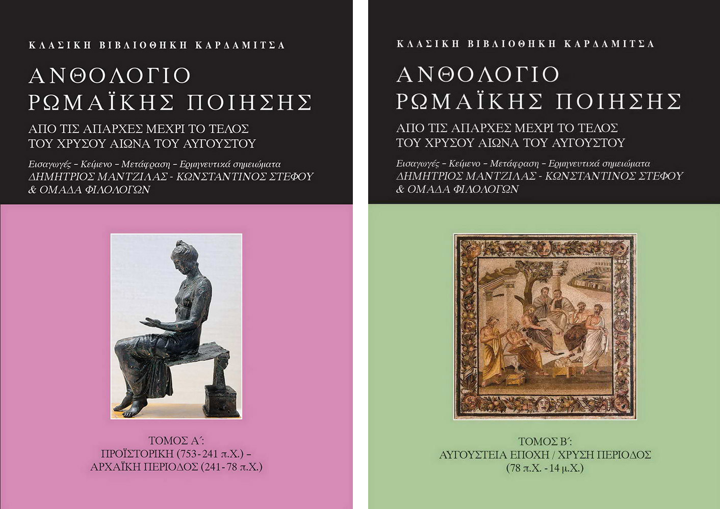 Δημήτριος Μαντζίλας, Κωνσταντίνος Στέφου και ομάδα φιλολόγων, Ανθολόγιο Ρωμαϊκής Ποίησης. Από τις απαρχές μέχρι το τέλος του χρυσού αιώνα του Αυγούστου. Εισαγωγές – Κείμενο – Μετάφραση – Ερμηνευτικά σημειώματα, τόμ. Α΄: Προϊστορική (753-241 π.Χ.) – Αρχαϊκή περίοδος (241-78 π.Χ.), τόμ. Β΄: Αυγούστεια εποχή / Χρυσή περίοδος (78 π.Χ.- 14 μ.Χ.), εκδ. Ινστιτούτο του Βιβλίου – Καρδαμίτσα, Αθήνα 2019, σελ. 576 (τόμ. Α’), 512 (τόμ. Β’)