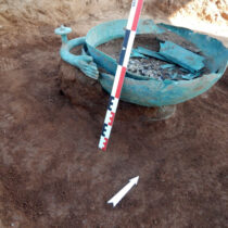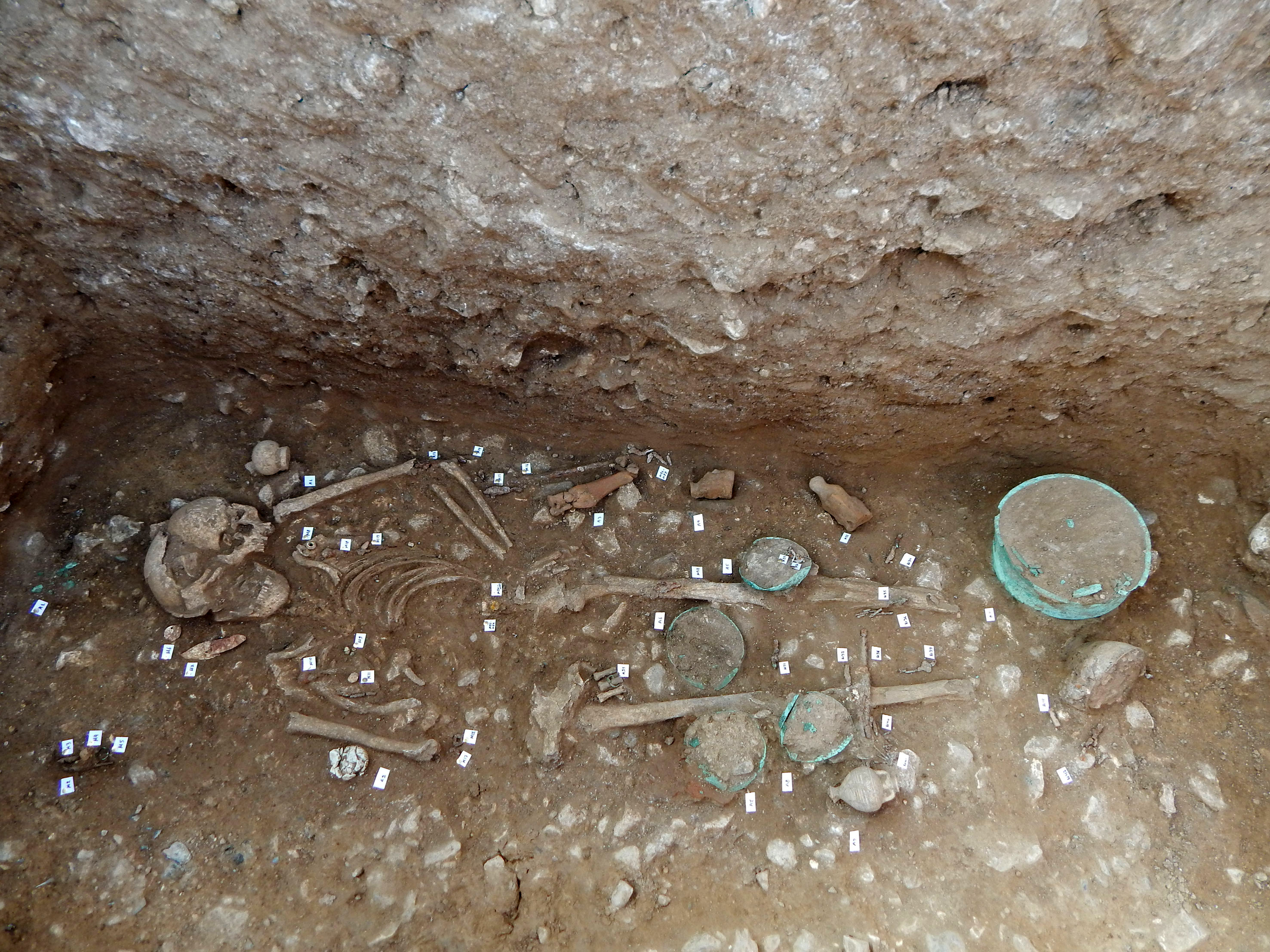Σε πέντε ταφές εφαρμόστηκε η πρακτική της δευτερογενούς καύσης. Η μία εντοπίστηκε σε μεγάλο κρατηρόσχημο χάλκινο αγγείο, εξαιρετικό δείγμα της αρχαίας μεταλλοτεχνίας. Το αγγείο σώζεται σε σχετικά καλή κατάσταση, έχει διάμετρο 0,55 μ. και φέρει πλαστική λαβή, που απολήγει σε δύο προσφύσεις με τη μορφή ανθρώπινων χεριών. Πρόκειται για δευτερογενή καύση ανδρός, και μάλιστα πολεμιστή, όπως υποδηλώνουν τα κτερίσματα: δύο σιδερένια ξίφη, δύο σιδερένια δόρατα και ένα χάλκινο κράνος «ιλλυρικού τύπου» πλαισίωναν το αγγείο, το οποίο καλυπτόταν με οριζόντια τοποθετημένη σχιστολιθική πλάκα.