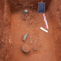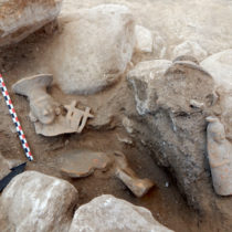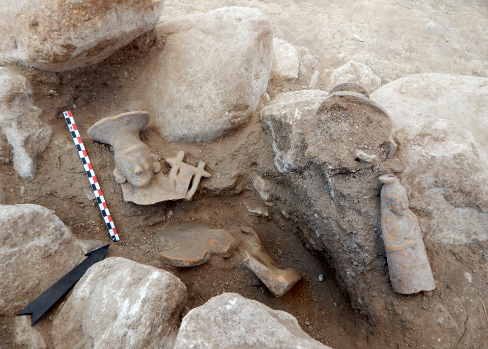 Επίσης, για πρώτη φορά ήρθαν στο φως σφαιρικός αρύβαλλος από φαγεντιανή και πήλινα ειδώλια καθιστής σε θρόνο γυναικείας μορφής, που κρατά περιστέρι και ένθρονης Σφίγγας με λύρα. Βρέθηκαν δύο πλαστικά αγγεία με όρθια γυναικεία μορφή και με προτομή ανδρικής μυθικής μορφής με δορά ζώου στο κεφάλι, πιθανώς του Ηρακλή, που χρονολογούνται στα αρχαϊκά χρόνια.