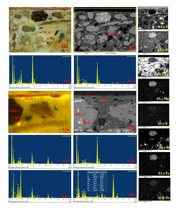 Τέλος σε ό,τι αφορά το μικροδείγμα ΑΓ05, από τη μικροσκοπική παρατήρηση προκύπτει ένα χονδρόκοκκο στρώμα καφέ κόκκινης απόχρωσης με έντονη και ποικίλη κοκκομετρία η οποία είναι ιδιαίτερα διακριτή σε συνθήκες παρατήρησης του φθορισμού (εικ. 7.E2.α). Όπως διαπιστώνεται από την ηλεκτρονική μικροανάλυση πρόκειται για ένα ασβεστιτικής προέλευσης μίγμα (εικ. Ε2.δ) με μικρή ποσότητα οξειδίων του σιδήρου και αργιλοπυριτικών οξειδίων (εικ.7.Ε1.γ και δ και Ε2.γ). Ιδιαίτερο προβληματισμό προκαλεί η υψηλή περιεκτικότητα του στρώματος σε άνθρακα (της τάξης του 40%), γεγονός που δικαιολογεί τον έντονο φθορισμό που παρατηρείται στην μικροσκοπία και μπορεί να ερμηνευθεί από την παρουσία οργανικού συνδετικού υλικού.