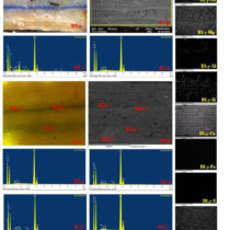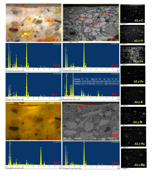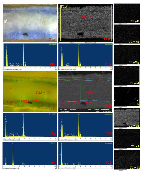 Η μικροσκοπική παρατήρηση πραγματοποιήθηκε στο οπτικό μεταλλογραφικό μικροσκόπιο Leica DM2700 M το οποίο διαθέτει αντικειμενικούς φακούς τύπου Ν Plan και Plan Fluotar υψηλής ευκρίνειας, καθώς επίσης σύστημα φωτογραφικών λήψεων και χειρισμού μέσω του ειδικού λογισμικού επεξεργασίας εικόνας Leica Application Suite (LAS). Εφαρμόστηκαν συνθήκες ανακλώμενου φωτός σκοτεινού πεδίου (Dark field, DF) και συνθήκες φθορισμού (Ι3) σε μεγεθύνσεις 50, 100 και 200 φορές. Η στοιχειακή ανάλυση πραγματοποιήθηκε στο ηλεκτρονικό μικροσκόπιο σάρωσης του Τμήματος Συντήρησης Αρχαιοτήτων και Έργων Τέχνης,  του Πανεπιστημίου Δυτικής Αττικής, τύπου JEOL6510LV, κατάλληλο για μορφολογική παρατήρηση γεωλογικών, μεταλλουργικών, βιολογικών, πολυμερών κ.ά. δειγμάτων με δυνατότητα λήψεων εικόνων μεγάλης ευκρίνειας δευτερογενών (Secondary Electron Images) και οπισθοσκεδαζομένων (Backscattered Electron Images) ηλεκτρονίων και μεγεθυντική ισχύ από 25 έως 300.000 φορές. Το όργανο συνοδεύεται από φασματόμετρο ενεργειακής διασποράς ακτίνων Χ, για ποιοτική και ποσοτική μικροανάλυση και χαρτογράφηση κατανομής στοιχείων (element mapping), με λογισμικό ανάλυσης INCA και AZtec EDS. Σε κάθε μικροδείγμα πραγματοποιήθηκαν αναλύσεις σε διάφορες περιοχές και σε διαφορετικές μεγεθύνσεις έτσι ώστε να λαμβάνονται φάσματα που αντιστοιχούν είτε στη συνολική στρωματογραφία, είτε σε κάθε στρώμα ξεχωριστά είτε σε κόκκους των υλικών.
