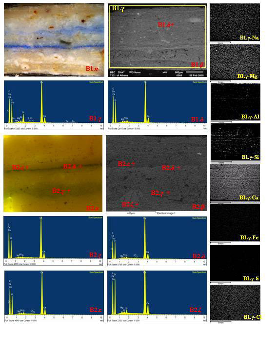 Τα δείγματα επίσης ΑΓ02 και ΑΓ03 παρουσιάζουν ομοιότητες μεταξύ τους τόσο στη μικροσκοπική παρατήρηση όσο και στα φάσματα της ηλεκτρονικής μικροσκοπίας (εικ. 5 και 6). Όπως προκύπτει από τη στρωματογραφία τους, απεικονίζονται επάλληλες επιστρώσεις ασβεστοχρωμάτων, διαφορετικής χρωματικής πυκνότητας, ενώ τα περατωτικά όρια αυτών δεν είναι διακριτά σε όλες τις περιπτώσεις. Διακρίνονται επάλληλες διαδοχές στρωμάτων, άλλοτε λευκού ασβεστοχρώματος, δηλαδή χωρίς την προσθήκη χρωστικής, με πάχος της τάξης 0,3-0,4 mm (εικ. 5.Β1.δ και Β2.ζ) και άλλοτε γαλάζιου, δηλαδή με την προσθήκη μπλε χρωστικής, με πάχος της τάξης 0,1-0,2 mm (εικ. 5.Β2.γ, δ και ε). Η χρωστική παρουσιάζει λεπτό διαμερισμό, στρογγυλευμένους κόκκους χωρίς έντονη κρυσταλλικότητα και διασπείρεται ανομοιογενώς στο στρώμα, χαρακτηριστικά τα οποία εμφανίζονται κυρίως σε οργανικής προέλευσης βαφές, παρά σε κρυσταλλικές φυσικές ανόργανες χρωστικές. Αξίζει δε να σημειωθεί ότι στο δείγμα ΑΓ02 (εικ. 5.B2.γ, δ, ε) δεν ανιχνεύτηκαν ανόργανα στοιχεία, εκτός εκείνων που αντιστοιχούν στη χρήση ανθρακικού ασβεστίου και των προσμίξεών του (αργιλοπυριτικά οξείδια). Το γεγονός αυτό θα μπορούσε ενδεχομένως να ερμηνευθεί από την υπόθεση της χρήσης της ευρέως χρησιμοποιούμενης μπλε οργανικής χρωστικής ινδικόν (indigo, Ιndigofera tinctoria L.) (Eastaugh κ.ά. 2004), η οποία είναι μία από τις αρχαιότερες φυσικές μπλε χρωστικές και χρησιμοποιείται μέχρι σήμερα (σημ. 7). Αντίθετα στο δείγμα ΑΓ03 (εικ. 6) σε περιοχές του γαλάζιου χρωματικού στρώματος, εκτός των παραπάνω χημικών στοιχείων ανιχνεύονται επιπροσθέτως μικρές ποσότητες νατρίου (Νa) και θείου (S) (εικ.6.Γ1.γ και Γ2.γ). Η παρουσία των στοιχείων αυτών, αν και σε ποσοστά της τάξης του 1,5% για το Na και 0,5% για το S, αποτελεί σοβαρή ένδειξη για τη χρήση της τεχνητής χρωστικής ultramarine (ουλτραμαρίν) η οποία είναι ένα σύνθετο θειούχο άλας του Νατρίου με αργιλοπυριτικά οξείδια. Το τεχνητό ultramarine, το οποίο άρχισε να παράγεται βιομηχανικά μετά το 1830, αποτελεί επίσης από τις πλέον ευρέως διαδεδομένες τεχνητές μπλε χρωστικές, έχει εντοπιστεί σε τοιχογραφίες, ζωγραφικά έργα και χειρόγραφα, ενώ στον ελληνικό χώρο, συχνά ονομαζόμενο και ως «λαζούρι», έχει χρησιμοποιηθεί, εκτός των άλλων, για τη βαφή των τοίχων με ασβεστοχρώματα, σύμφωνα με την παραδοσιακή τεχνική. Σημειώνεται ακόμα ότι λόγω του τρόπου παρασκευής ενδέχεται να περιέχει και διάφορες προσμίξεις, γεγονός το οποίο ερμηνεύει την παρουσία των στοιχείων Fe, Ca, K και Mg στο φάσματα (Eastaugh κ.ά. 2004). Αξίζει όμως να σημειωθεί εδώ ότι συχνά παρατηρείται αναντιστοιχία ανάμεσα στην «κοινή» ονομασία των χρωστικών με την οποία αναφέρονται σε διάφορα εγχειρίδια και την επιστημονική ονομασία τους που απορρέει από τον ακριβή χημικό τύπο. Στην ελληνική βιβλιογραφία, η σύγχυση αυτή  είναι ιδιαίτερα χαρακτηριστική  ως προς τις ονομασίες των δύο μπλε χρωστικών που απαντούν με τις ονομασίες «λουλάκι» και «λαζούρι». Συγκεκριμένα, η ονομασία «λουλάκι» άλλοτε αποδίδεται στο ινδικόν και άλλοτε στο ultramarine, όπως το ίδιο συμβαίνει και με την ονομασία «λαζούρι» (σημ. 7 και 8). Ωστόσο, στην παρούσα δημοσίευση, oι συγγραφείς υιοθετούν την άποψη ότι και ετυμολογικώς, αλλά και σύμφωνα με τη λαϊκή παράδοση ο όρος «λαζούρι» (εκ του ορυκτού λαζουρίτης) αντιστοιχεί στο τεχνητό ultramarine, ενώ ο όρος «λουλάκι» στο ινδικόν. Το ζήτημα αυτό αποτελεί ένα ενδιαφέρον πεδίο μελέτης στο οποίο οι συγ