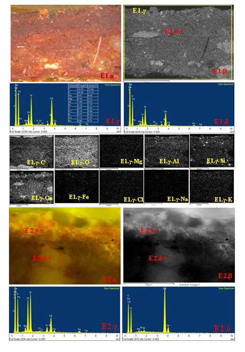 Σε ό,τι αφορά τη χημική σύσταση του στρώματος ΙΙ, όπως προκύπτει από την ηλεκτρονική μικροανάλυση, πρόκειται για καθαρό ασβεστόχρωμα, χωρίς προσμίξεις, ιδιαίτερα λεπτόκοκκο (εικ. 3.Α2.δ και εικ. 4.Δ2.δ), ενώ το χρωματικό στρώμα (στρώμα ΙΙΙ) ταυτοποιείται ως μια κόκκινη ώχρα, της οποίας βασικό συστατικό είναι ο αιματίτης, δηλαδή το οξείδιο του σιδήρου (εικ. Α2.γ και εικ. 4.Δ2.γ). Στην τυπική μορφή της ώχρας ο αιματίτης συνυπάρχει με αργιλοπυριτικά οξείδια, ως εκ τούτου ανιχνεύονται έντονες κορυφές αργιλίου και πυριτίου. Οι κόκκινες ώχρες είναι φυσικές γεώδεις χρωστικές των οποίων το χρώμα παρουσιάζει διαφορετικές αποχρώσεις του κόκκινου, καφε-κόκκινου και του πορφυρού και έχουν χρησιμοποιηθεί ευρέως από την αρχαιότητα μέχρι σήμερα για τη διακόσμηση κτηρίων και αντικειμένων (Eastaugh κ.ά. 2004). Αξίζει να σημειωθεί επιπλέον ότι το υψηλό ποσοστό άνθρακα, της τάξης του 50%, που προκύπτει από την ποσοτική ανάλυση του κόκκινου χρωματικού στρώματος, σε συνδυασμό με την έλλειψη διάχυσης της χρωστικής στο υπόστρωμα, υποδηλώνει τη χρήση χρωματικού μίγματος πλούσιου σε οργανικό φορέα, το οποίο παραπέμπει σε βιομηχανικές χρωστικές. Στα νεότερα χρόνια, παράλληλα με την κόκκινη ώχρα χρησιμοποιείται επίσης η συνθετική χρωστική κόκκινο του καδμίου (cadmium red), η οποία ανήκει σε μια μεγάλη ομάδα βιομηχανικών χρωστικών του καδμίου και πρωτοεμφανίστηκε εμπορικά το 1910 (Eastaugh κ.ά. 2004). Το κόκκινο του καδμίου μοιάζει πολύ με το κόκκινο της ώχρας, έτσι ώστε συχνά να πωλείται αντ’ αυτής ή σε εξέταση κόκκινου χρώματος ώχρας διά γυμνού οφθαλμού αυτό να περιγράφεται ως κόκκινο του καδμίου.
