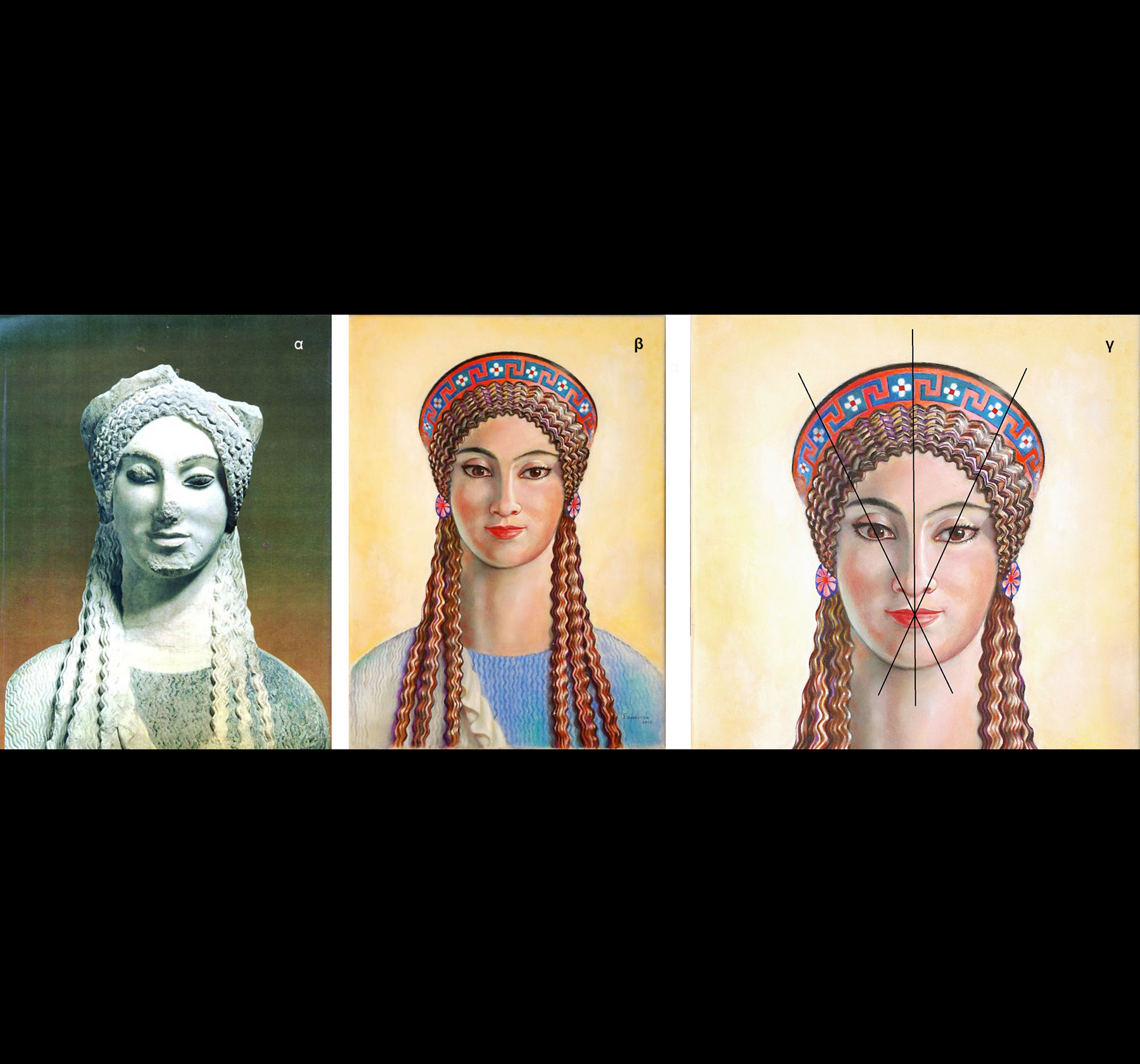 Το πρόσωπο παρουσιάζει ασυμμετρία. Τα αμυγδαλωτά μάτια της Κόρης, ελαφρώς εξόφθαλμα, με υψωμένα τοξοειδή φρύδια, εμφανίζουν διαφορές μεταξύ τους. Το δεξί μάτι της, σχεδιασμένο ψηλότερα από το αριστερό, έχει μεγαλύτερη την ίριδα, που κοιτά πιο χαμηλά. Δεν πρόκειται για κακοτεχνία. Το υπόλοιπο πρόσωπο αποδίδεται συμμετρικό, όπως συμμετρικά σχεδιασμένα είναι η άψογα περίτεχνη γεωμετρική σύνθεση της κόμης και το διάδημα. Οι κάθετες γραμμές από τα ίχνη των ζωγραφισμένων μαιάνδρων του διαδήματος που αναπαραστάθηκε, νοητά επεκτεινόμενες, περνούν όλες από το σημείο του κέντρου των χειλιών της. Επομένως, η ασυμμετρία των ματιών της είναι ηθελημένη (εικ. 1γ).