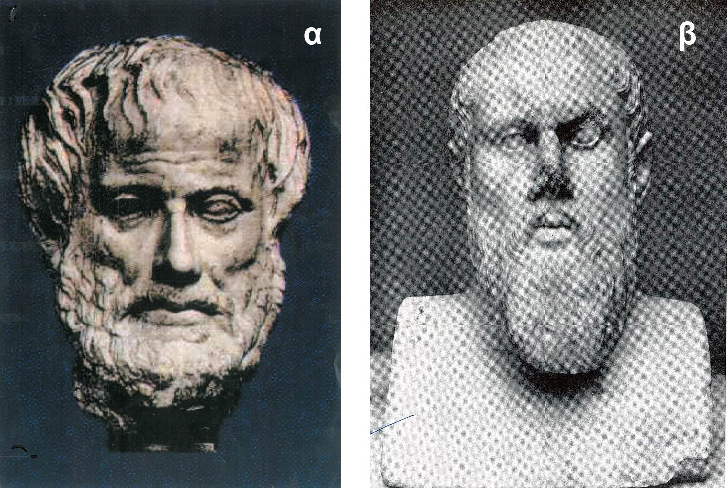 Ειδικότερα, στην εικόνα 2α ο Αριστοτέλης εικονίζεται με μεγαλύτερο και ελαφρώς ογκώδη τον αριστερό του οφθαλμό (Kunsthistorisches Museum Wien, σημ. 10). Στην εικόνα 2β, ο Ζήνων (ο εκ Κιτίου) με μεγαλύτερο αριστερό οφθαλμό και αυτί, και σε διαφορετική θέση (Gallo-Roman Museum of Lyon, σημ. 11). Σημειώνουμε πως σε άλλο αντίγραφο η κεφαλή του Ζήνωνα παρουσιάζεται με διαφορετικές ασυμμετρίες (σημ. 12).