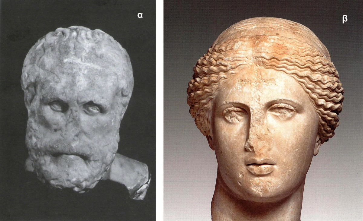 Στην εικόνα 4α, παρατηρούμε ένα από τα μαρμάρινα αντίγραφα της κεφαλής ενός άγνωστου φιλόσοφου (τύπος New York-Rome-Caesarea) στο οποίο εικονίζεται –και μόνο σε αυτό το αντίγραφο– με στενόμακρα μάτια που έχουν την ίδια πλάγια κλίση (Israel Antiquities Authority, σημ. 16). Εμφανίζει μια ομοιότητα στο σχεδιασμό οφθαλμών με κεφαλές της Αφροδίτης της σχολής του Πραξιτέλη, του 4ου αι. π.Χ. Στην εικόνα 4β, κεφαλή της θεάς Αφροδίτης της Κνίδου ή Φρύνης (Εθνικό Αρχαιολογικό Μουσείο της Αθήνας, σημ. 17), με οφθαλμούς στενόμακρους που σχεδιάστηκαν με την ίδια πλάγια κλίση. Όμοια πλάγια κλίση στενόμακρων οφθαλμών παρουσιάζουν αγάλματα της θεάς, που εκτίθενται το ένα στο Εθνικό Αρχαιολογικό Μουσείο Αθήνας και το άλλο στο Μουσείο της Αρχαίας Μεσσήνης.