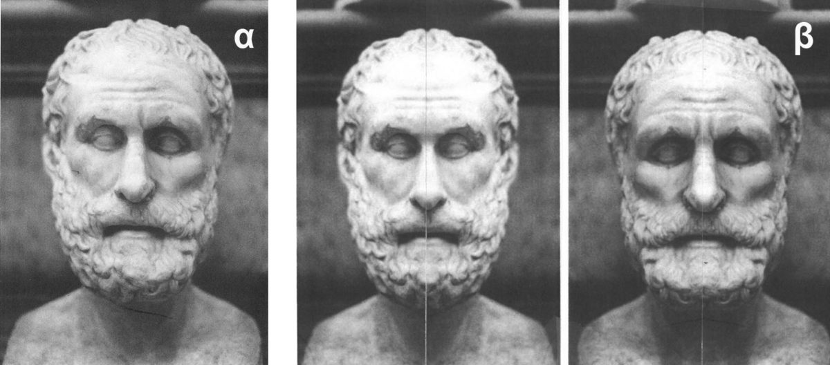Ορισμένα μαρμάρινα αντίγραφα κεφαλών, δημιουργημένα κατά τη Ρωμαϊκή περίοδο, που αναπαριστούν αρχαίους Έλληνες κορυφαίους του πνεύματος, παρουσιάζουν ασυμμετρίες. Φιλόσοφοι και ποιητές εμφανίζονται με χαρακτηριστικές ανομοιότητες (ασυμμετρίες) μεταξύ των δύο μερών της κεφαλής (σημ. 1). Τα γλυπτά αυτά πορτρέτα αποτελούν μικρό ποσοστό μεταξύ των εκατοντάδων ρωμαϊκών αντιγράφων. Οι ασυμμετρίες τους είναι σκόπιμες, υπολογισμένες, δεν οφείλονται σε κακοτεχνία ή συνήθεις φυσικές διαφορές στα χαρακτηριστικά των προσώπων, και φαίνεται πως σχεδιάστηκαν από τους γλύπτες της Ρωμαϊκής περιόδου κατόπιν παραγγελίας. Πιθανώς τα πρωτότυπα αρχαία ελληνικά αγάλματα δεν παρουσίαζαν τις ανομοιότητες των ρωμαϊκών αντιγράφων τους (σημ. 2).
