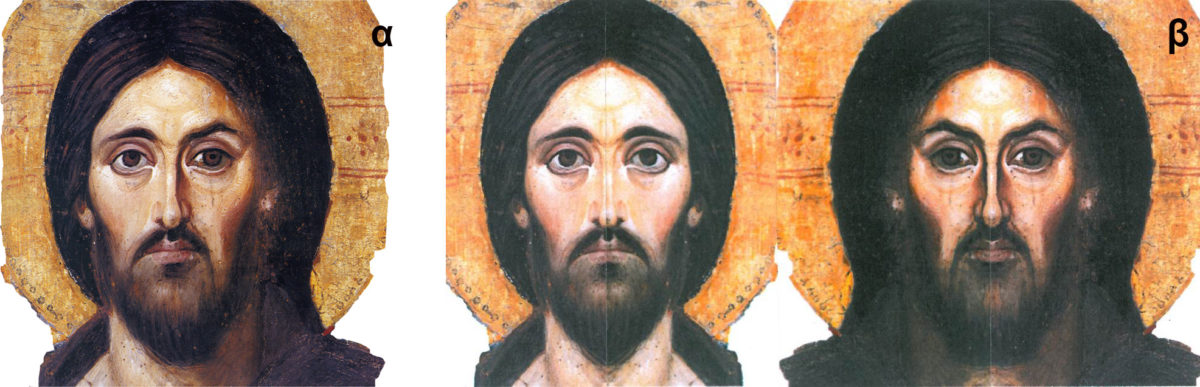 Στην εικόνα Χριστός Παντοκράτωρ του 6ου αιώνα, της Μονής Σινά (εικ. 7), έργο μεγάλου καλλιτέχνη όπως γράφει ο Κ. Μανάφης, οι δύο πλευρές του προσώπου διαφέρουν σαφώς στο σχεδιασμό, εκφράζοντας τη διττή υπόσταση, δηλαδή αφενός «…την ανθρώπινη φύση του Θεανδρικού προσώπου», αφετέρου «…τη Θεία φύση του Χριστού» (σημ. 25). Ο αριστερός οφθαλμός εικονίζεται μεγαλύτερος, όπως και η ίριδα, ενώ η κόρη είναι χαμηλότερα ζωγραφισμένη συγκρινόμενη με τον δεξιό οφθαλμό. Αριστερό αυτί και ρουθούνι βρίσκονται ψηλότερα από εκείνα της άλλης πλευράς.