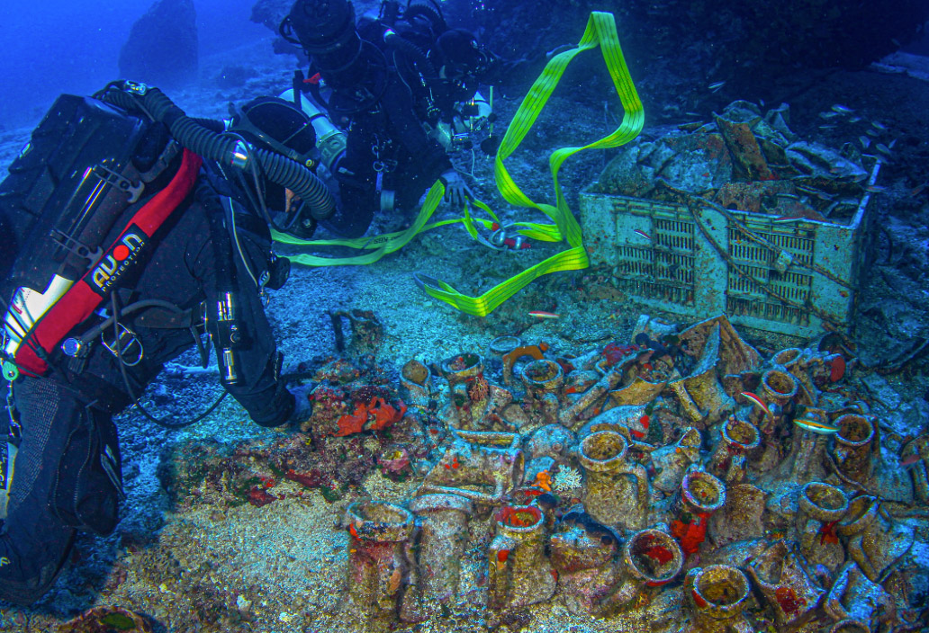 Επιπρόσθετα ανελκύστηκε πλαστικός κάλαθος διαστάσεων 110x110x45 εκατοστών, γεμάτος με τμήματα αμφορέων, βάσεις, λαιμούς και σώματα σωζόμενα από την κοιλία του αγγείου ως τη βάση.
