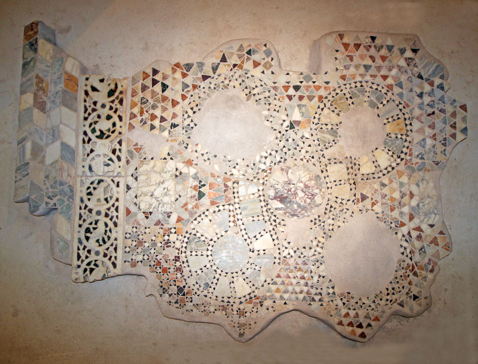 Στο μεγαλύτερο μέρος του κοσμείται με παραλλαγή του θέματος των πέντε άρτων, δηλαδή πέντε κύκλων που εφάπτονται. Περιλαμβάνει επίσης και δύο μαρμάρινες πλάκες με επιπεδόγλυφο διάκοσμο σηρικών τροχών (μεταλλίων που συνδέονται μεταξύ τους με μικρότερους κύκλους) και περικλείουν κυρίως μορφές ζώων. Το βάθος καλύπτεται με μικρά χρωματιστά κομμάτια μαρμάρου. Οι πλάκες έχουν τοποθετηθεί σε δεύτερη χρήση, όπως φαίνεται από τη διακόσμηση, που δεν είναι συνεχής από τη μία πλάκα στην άλλη.