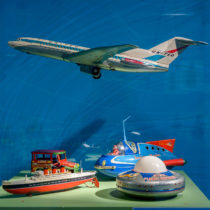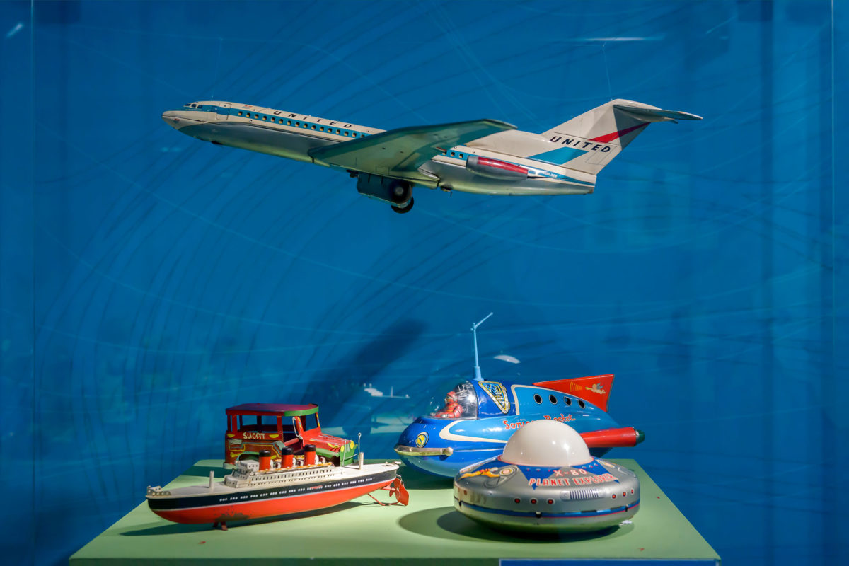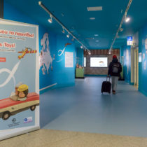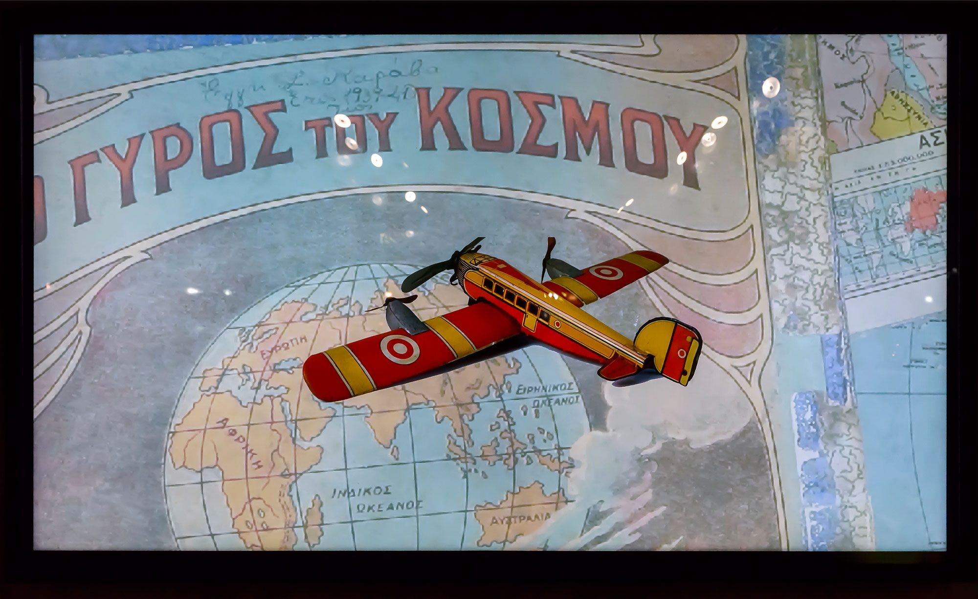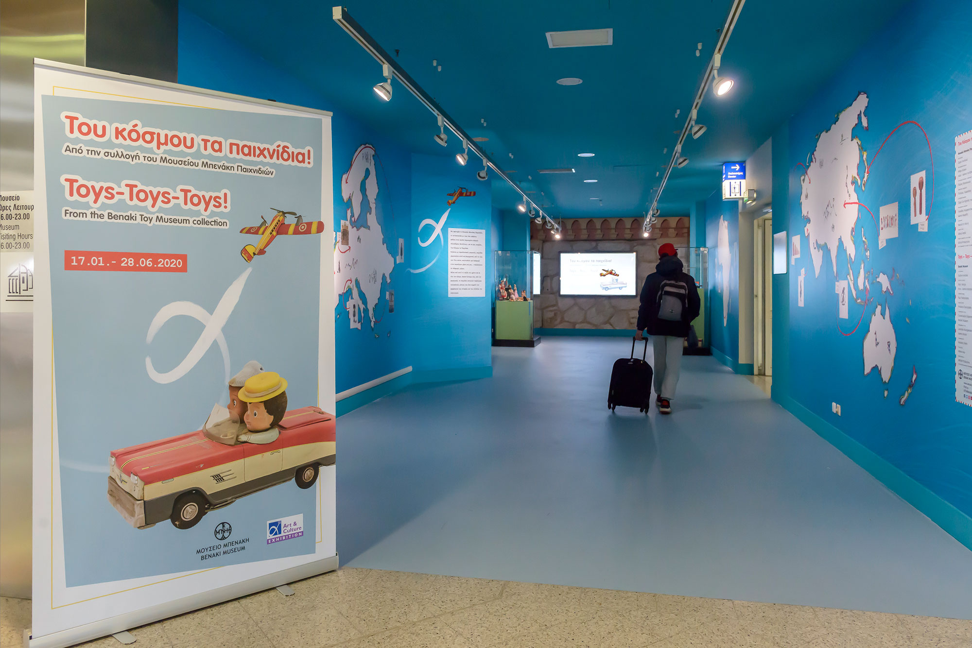 Παιχνίδια από τις συλλογές του Μουσείου Μπενάκη ταξιδεύουν τους επισκέπτες του αεροδρομίου σε χώρες κοντινές αλλά και μακρινές. Κούκλες με τοπικές φορεσιές, μεταφορικά μέσα, παιχνίδια παραδοσιακά, χειροποίητα, αλλά και βιομηχανικά, μας συστήνονται και μας διηγούνται την ιστορία τους. Μέσα από αυτό το ταξίδι από τον 19ο έως τα τέλη του 20ού αιώνα διαπιστώνουμε πως, πέρα από την ψυχαγωγία, τα παιχνίδια αποτελούν κομμάτι του ψηφιδωτού της ιστορίας και της εξέλιξης του πολιτισμού.