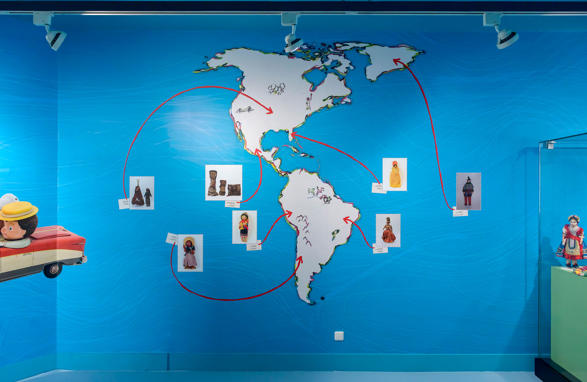 Το ταξίδι ξεκινά με σκηνικό την επιφάνεια του παγκόσμιου χάρτη, όπου φωτογραφίες παιχνιδιών καλούν τον ταξιδιώτη να γνωρίσει ή να αναγνωρίσει τη χώρα προέλευσής τους, ενώ κούκλες με πολύχρωμες φορεσιές μας παρουσιάζουν τον τόπο τους.
