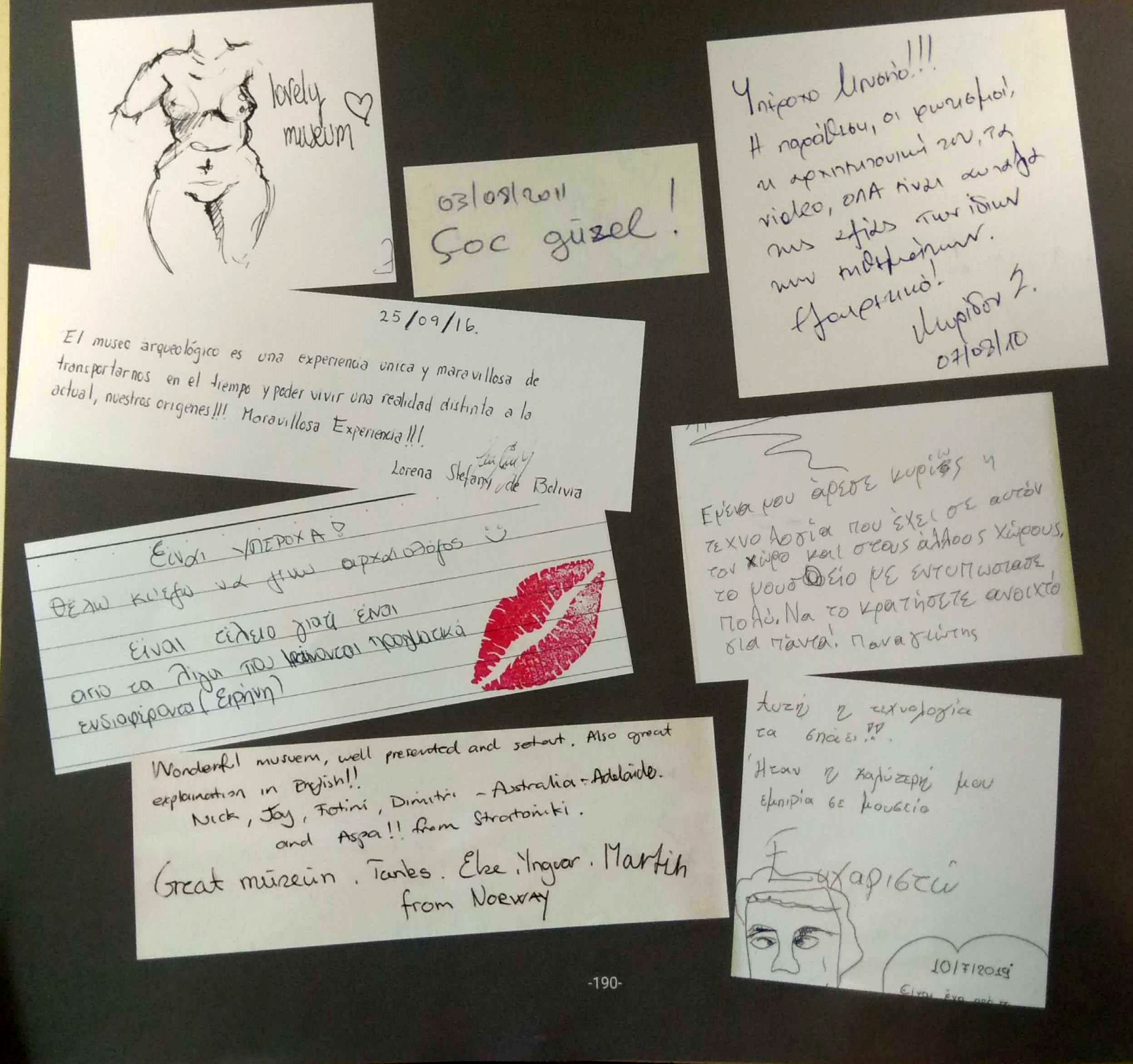 «Çok güzel» (3.8.2011). «Εμένα μου άρεσε κυρίως η τεχνολογία που έχει σε αυτόν τον χώρο και στους άλλους χώρους. Το μουσείο με εντυπωσίασε πολύ! Να το κρατήσετε ανοιχτό για πάντα! Παναγιώτης». «Αυτή η τεχνολογία τα σπάει!» (10.7.19). «Ήταν η καλύτερη εμπειρία σε μουσείο. Ευχαριστώ!». «Είναι υπέροχα, θέλω κι εγώ να γίνω αρχαιολόγος!». «Γεια, είμαι η Ελίσα και μετά από αυτή την έκθεση θα αρχίσω να διαβάζω ιστορία»…