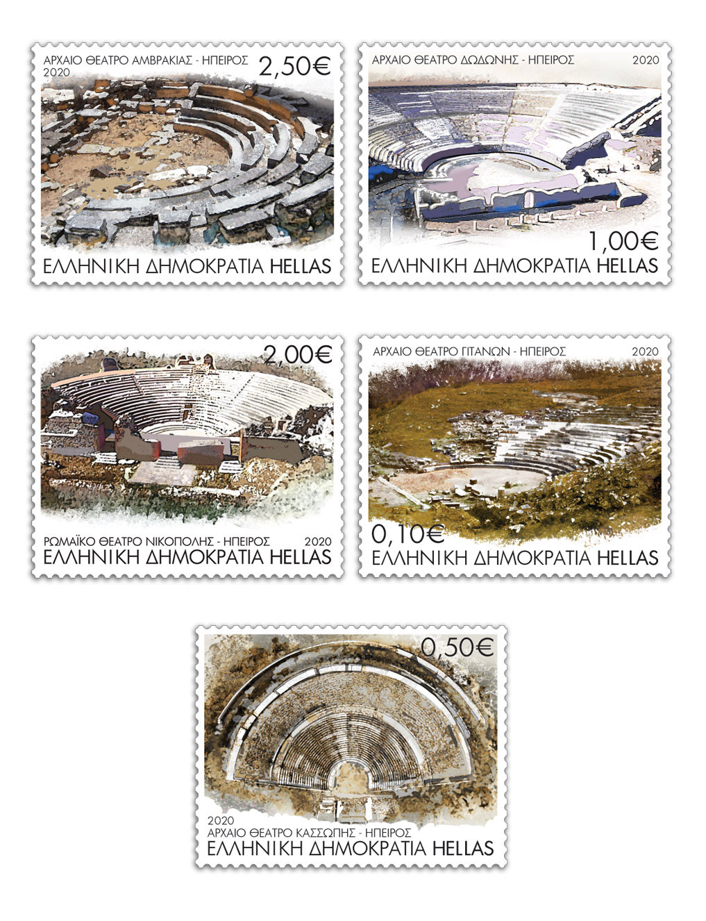 Η νέα αναμνηστική σειρά αποτελείται από πέντε γραμματόσημα που αποκαλύπτουν την πλούσια πολιτιστική κληρονομιά της Ηπείρου. Σε αυτά απεικονίζονται: Το Αρχαίο Θέατρο Δωδώνης που υπήρξε αναπόσπαστο τμήμα του πανελλήνιου ιερού της Δωδώνης, το Αρχαίο Θέατρο Νικόπολης, ένα από τα εντυπωσιακότερα μνημεία της Ελλάδας που συνδέεται με την τέλεση των «Νέων Ακτίων», αγώνων αφιερωμένων στον Απόλλωνα, το Αρχαίο Θέατρο Κασσώπης, με την πανοραμική θέα προς τον Αμβρακικό κόλπο, το Ιόνιο Πέλαγος και τα Ακαρνανικά όρη, το Αρχαίο Θέατρο Αμβρακίας, που είναι το μικρότερο από τα θέατρα που έχουν αποκαλυφθεί μέχρι σήμερα, και το Αρχαίο Θέατρο Γιτάνων το οποίο κτίστηκε στην πρωτεύουσα της αρχαίας Θεσπρωτίας και του οποίου πολλά εδώλια φέρουν επιγραφές με ονόματα.
