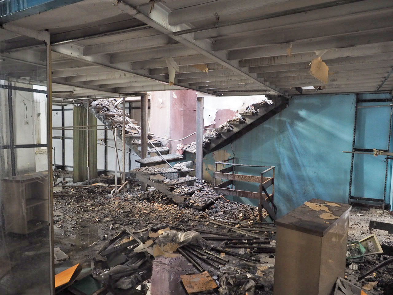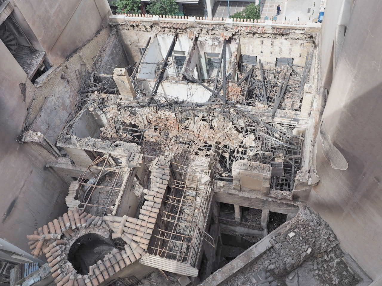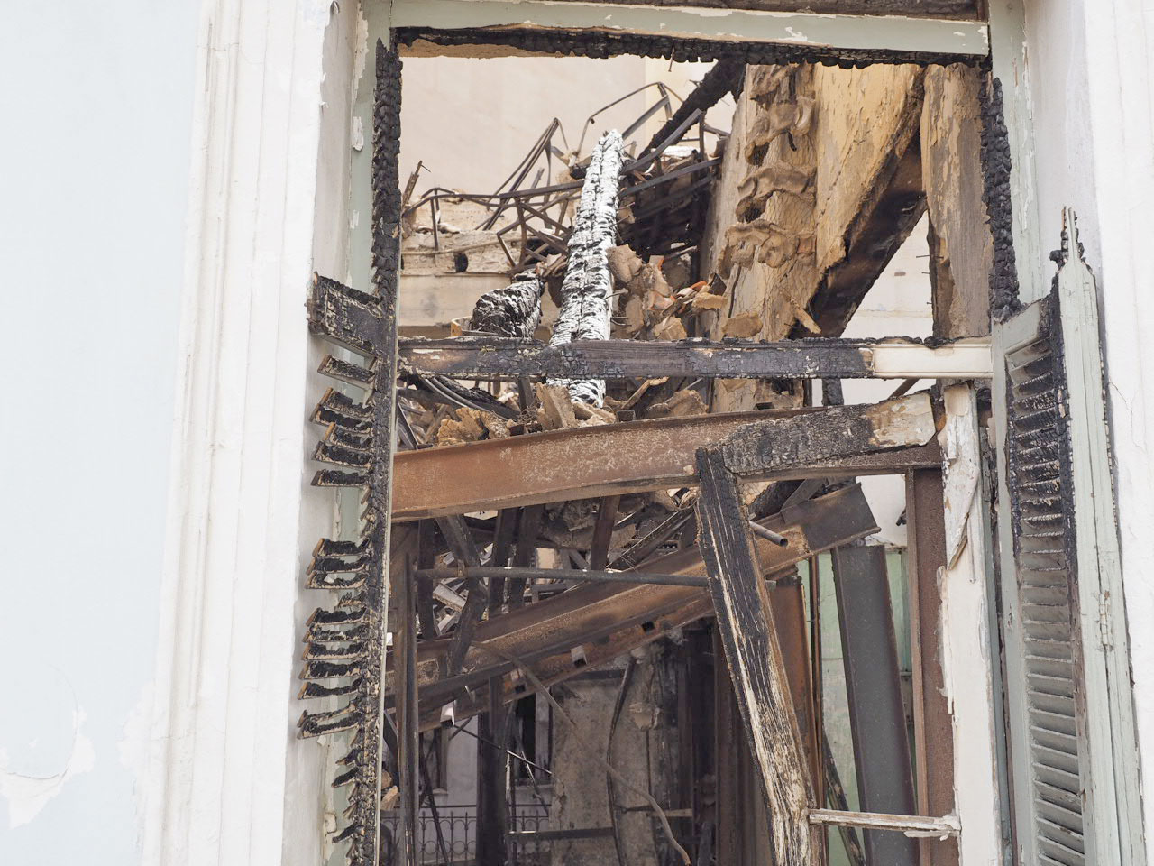 Η πυρκαγιά φαίνεται να ξεκίνησε και να περιορίστηκε στον δεύτερο όροφο του αρχικού κτηρίου, με αποτέλεσμα να έχει καταστραφεί μέρος του ξύλινου πατώματος του δευτέρου ορόφου και να έχει καταρρεύσει η ξύλινη στέγη. Ωστόσο, η νεοκλασική όψη επί της οδού Σταδίου, ο πρώτος όροφος, τα δομικά στοιχεία του ισογείου, του πρώτου ορόφου και του υπογείου δεν έχουν υποστεί ιδιαίτερες βλάβες. Οι εσωτερικές νεωτερικές διαρρυθμίσεις τα πατάρια και οι ψευδοροφές έχουν υποστεί αρκετές ζημιές λόγω της κατάρρευσης του δαπέδου του υπερκείμενου ορόφου. Επίσης, έχουν διασωθεί (με αρκετές ζημιές) το σημαντικό παλαιό ξύλινο κλιμακοστάσιο του κτηρίου και ο ζωγραφικός διάκοσμος του πρώτου ορόφου.