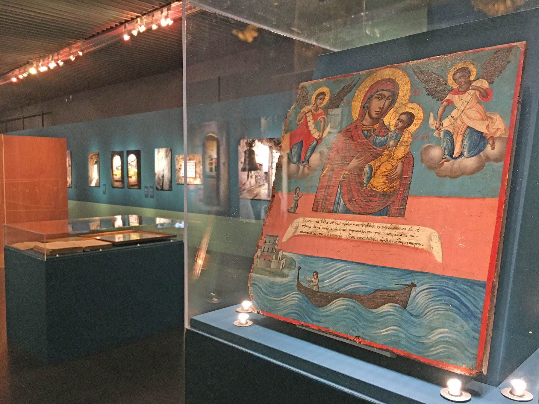 —Εικόνα της Θεοτόκου Οδηγήτριας με το Θαύμα της Παναγίας στα Στροφάδια, του 18ου αιώνα.
