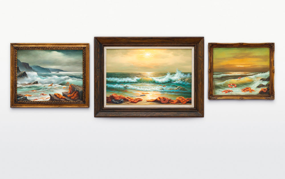 Ο καλλιτέχνης «πήρε τρεις ρομαντικούς καμβάδες που απεικόνιζαν θαλάσσια τοπία του 19ου αιώνα», στα οποία στη συνέχεια σκόρπισε «γιλέκα διάσωσης και εγκαταλειμμένους σημαντήρες», εξηγεί ο Sotheby’s σε ανακοίνωση.