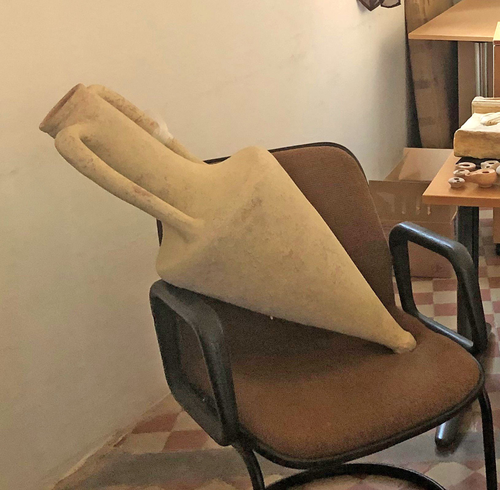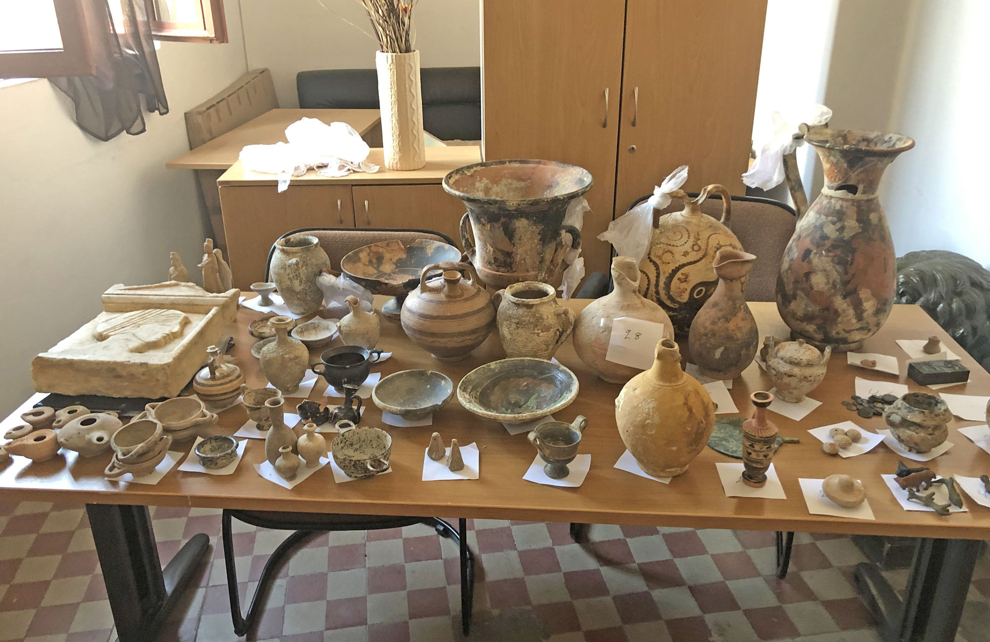 Σε έρευνα που ακολούθησε στο σπίτι του βρέθηκαν και κατασχέθηκαν: άνω τμήμα μαρμάρινης επιτύμβιας στήλης με ανάγλυφη μορφή, 81 αρχαία αντικείμενα (ειδώλια, αγνύθες, λυχνάρια, μυροδοχεία, φιαλίδια, αγγεία, υδρία, κάνθαρος, αμφορέας κ.ά.) και 47 νομίσματα.