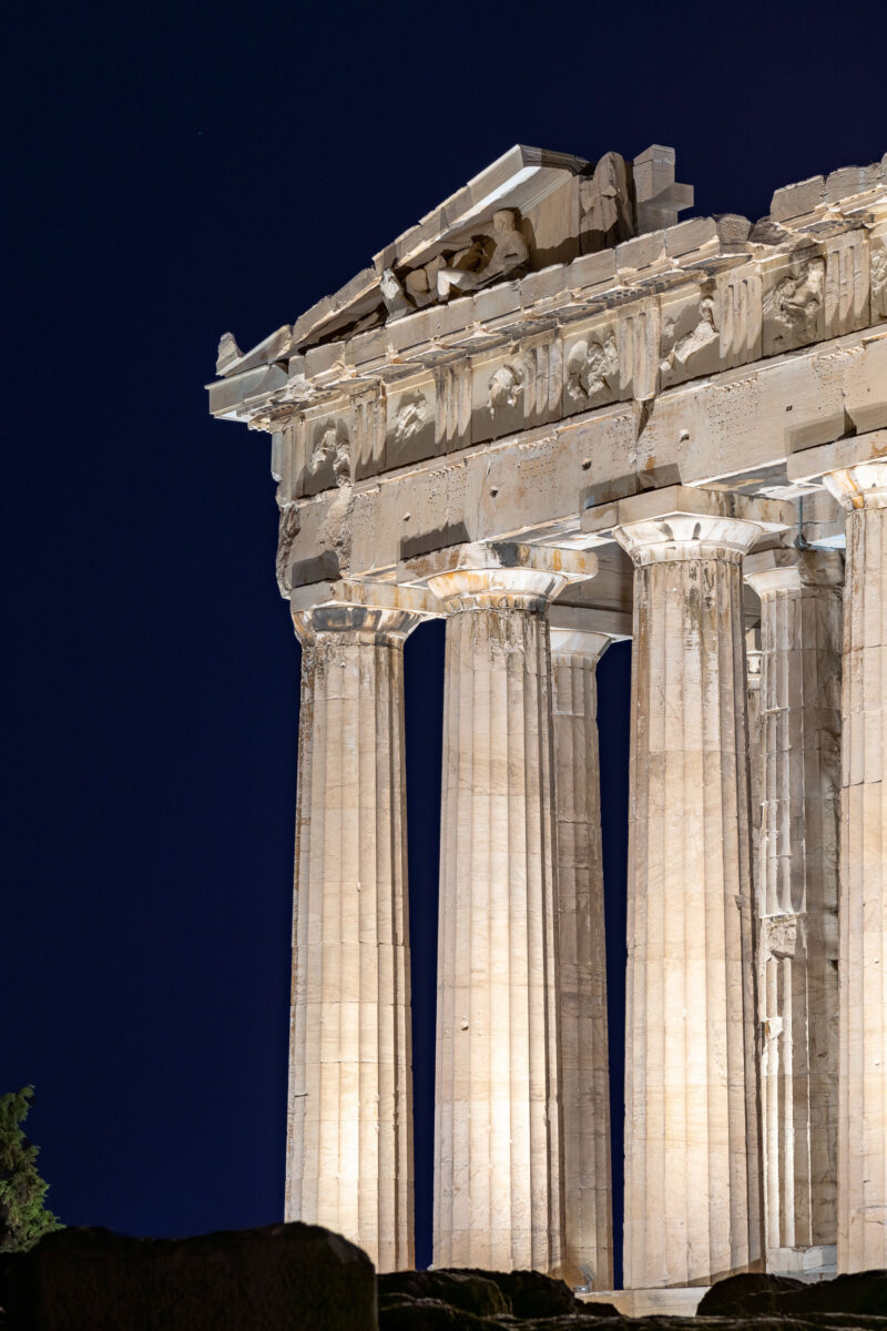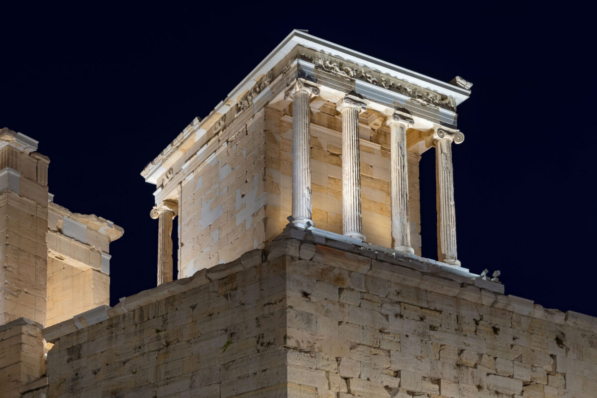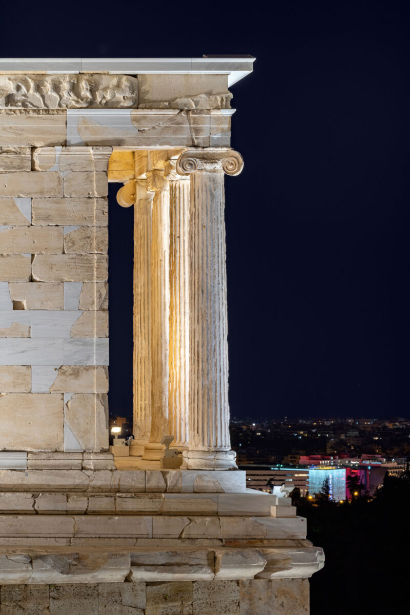 Η μελέτη για τον φωτισμό της Ακρόπολης δεν περιορίστηκε στο αισθητικό μέρος, αλλά συμπεριλαμβάνει τη σημαντική αναβάθμιση των υφιστάμενων υποδομών με τον εκσυγχρονισμό της ηλεκτρολογικής εγκατάστασης και του συστήματος αυτοματισμού και ελέγχου των φωτιστικών σωμάτων. Αναδεικνύει το σύνολο του Ιερού Βράχου, τα Τείχη, τον όγκο και τη γεωμετρία κάθε μνημείου, από κάθε πιθανό σημείο θέασης. Τα μάρμαρα, πιο λευκά από ποτέ, αντανακλούν κάθε πτυχή, κάθε γεωμετρικό σχήμα, κάθε φυσικό υλικό, τονίζοντας το ανάγλυφο της διακόσμησης κάθε μνημείου.