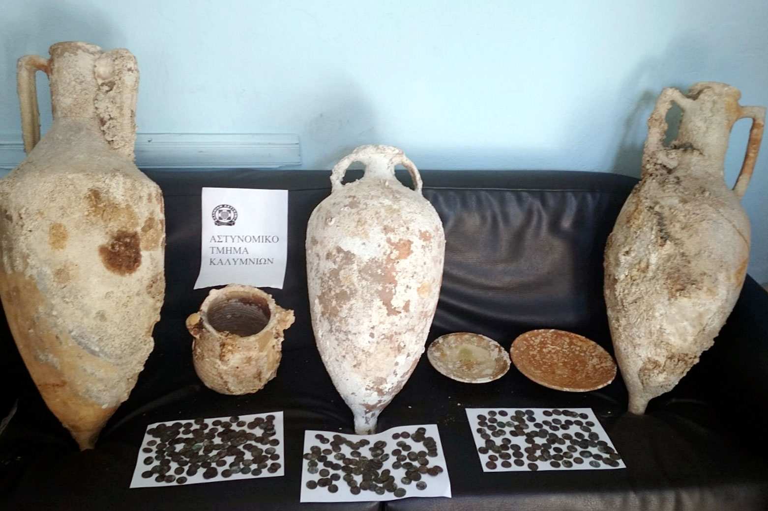 Κάτοικος της Καλύμνου συνελήφθη από αστυνομικούς του ΑΤ Καλυμνίων, την περασμένη Παρασκευή το πρωί, κατηγορούμενος για παράνομη κατοχή αρχαιοτήτων. Ειδικότερα, στο πλαίσιο επιχειρησιακών δράσεων της Γενικής Περιφερειακής Αστυνομικής Διεύθυνσης Νοτίου Αιγαίου για την προστασία της πολιτιστικής κληρονομιάς και έπειτα από αξιολόγηση στοιχείων πραγματοποιήθηκε έρευνα στην κατοικία του κατηγορούμενου, όπου, παρουσία δικαστικού λειτουργού, βρέθηκαν και κατασχέθηκαν 326 χάλκινα-επαργυρωμένα νομίσματα, 3 πήλινοι αμφορείς, 2 πήλινα εφυαλωμένα πινάκια και μία πήλινη χύτρα.