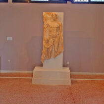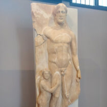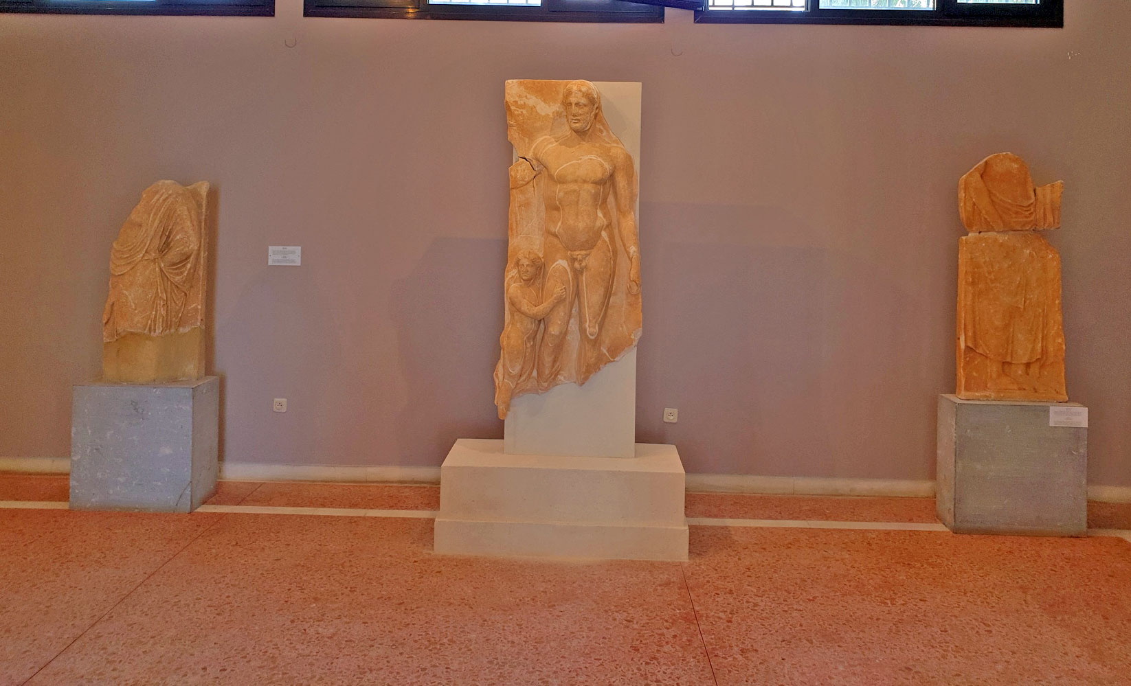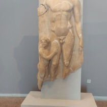 Έχει ύψος 1,70 μ., πλάτος 0,765 μ. και σώζεται αποσπασματικά. Εικονίζεται γυμνός γενειοφόρος άνδρας με στλεγγίδα στο αριστερό χέρι. Πρόκειται για αθλητή (παλαιστρίτης) που συνοδεύεται από μικρή παιδική μορφή με πτηνό. Το θέμα «αθλητής με παίδα»  είναι σύνηθες στη  γλυπτική των Κλασικών Χρόνων και η παρουσία του παίδα θεωρείται ότι ενέχει έναν ιδιαίτερο συμβολισμό που έχει δεχθεί πολλές ερμηνείες (υπηρέτης του αθλητή,  έφηβος ερωτικός σύντροφος κ.ά.). Το μικρό μέγεθος και η ηλικία του παίδα, φαίνεται να αποκλείουν τον συνήθως ερωτικό χαρακτήρα που αποδίδεται σε παρόμοιες σκηνές, ενώ η παρουσία του πτηνού παραπέμπει στο γνωστό θέμα της ψυχής που απέρχεται.