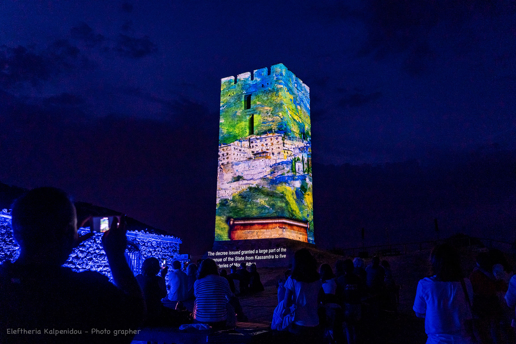 Ο αρχαιολόγος της Εφορείας Αρχαιοτήτων Χαλκιδικής και Αγίου Όρους, Νικόλαος Μερτζιμέκης, εξηγεί στο ΑΠΕ-ΜΠΕ ότι το τρισδιάστατο αυτό ντοκιμαντέρ δημιουργήθηκε από την Εφορεία Αρχαιοτήτων (Υπουργείο Πολιτισμού και Αθλητισμού) με σκοπό να προβάλλεται στον πύργο, ενώ μέρος του έχει σταλεί ως υποψηφιότητα στον διεθνή διαγωνισμό «Museum in Short», που διοργανώνεται κάθε χρόνο για μικρής διάρκειας προβολές που σχετίζονται με μουσεία και άλλους πολιτιστικούς οργανισμούς.