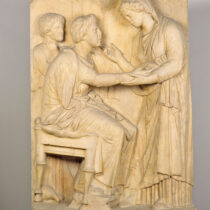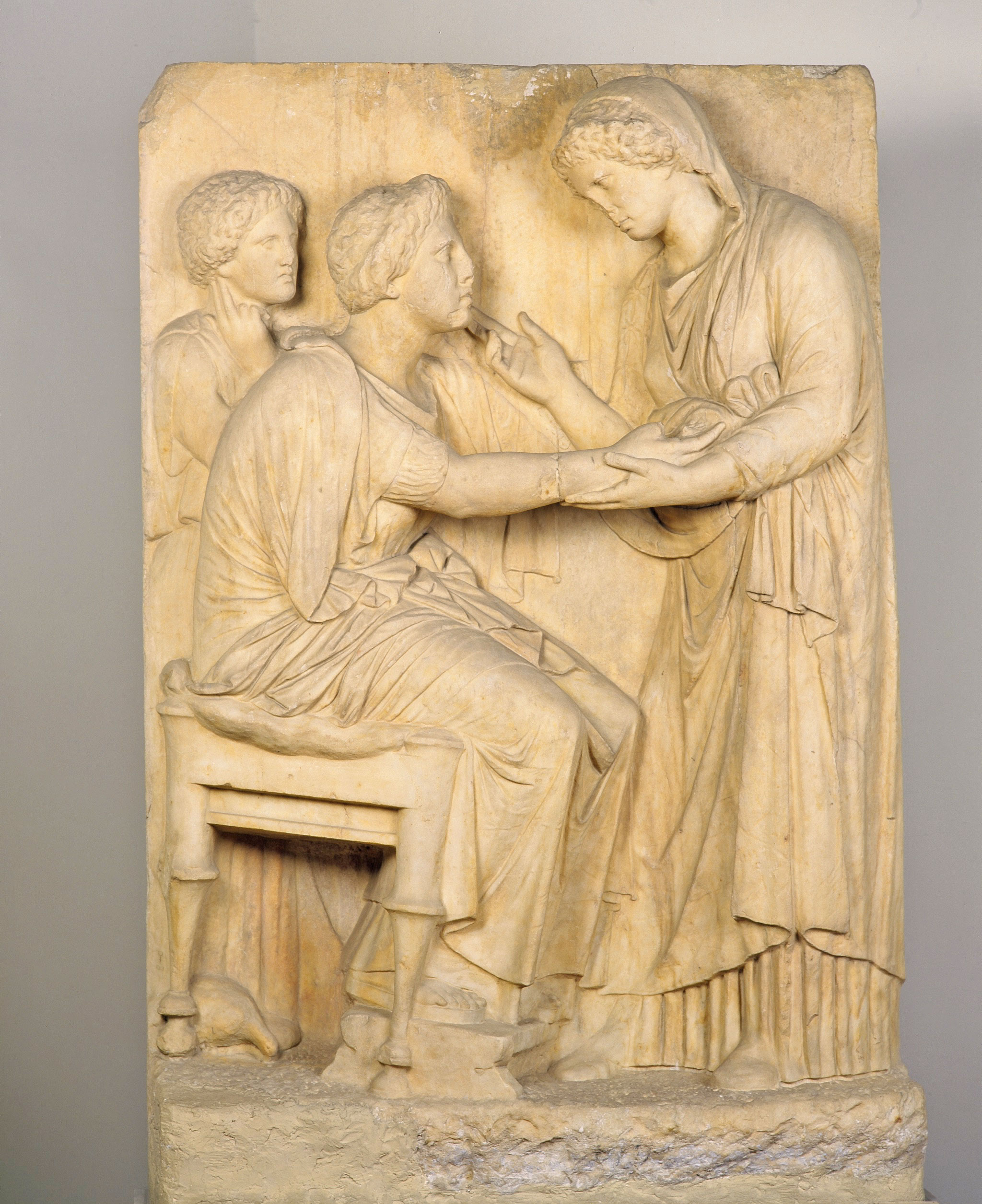 Πρόκειται για έργο που χρονολογείται το 350-325 π.Χ. και συγκινεί με την αμεσότητα του θέματος. Η νεκρή κάθεται σε σκαμνί απλώνοντας το χέρι προς μια συγγενή της που το κρατά τρυφερά από τον καρπό και της απευθύνει το λόγο υψώνοντας το άλλο της χέρι. Αριστερά στέκεται συλλογισμένο ένα κορίτσι. Κάτω από το κάθισμα της νεκρής ραμφίζει μια πέρδικα. Το μνημείο, γνωστό ως στήλη του αποχαιρετισμού, είχε άλλοτε μορφή ναΐσκουμε αέτωμα, παραστάδες και βάθρο.