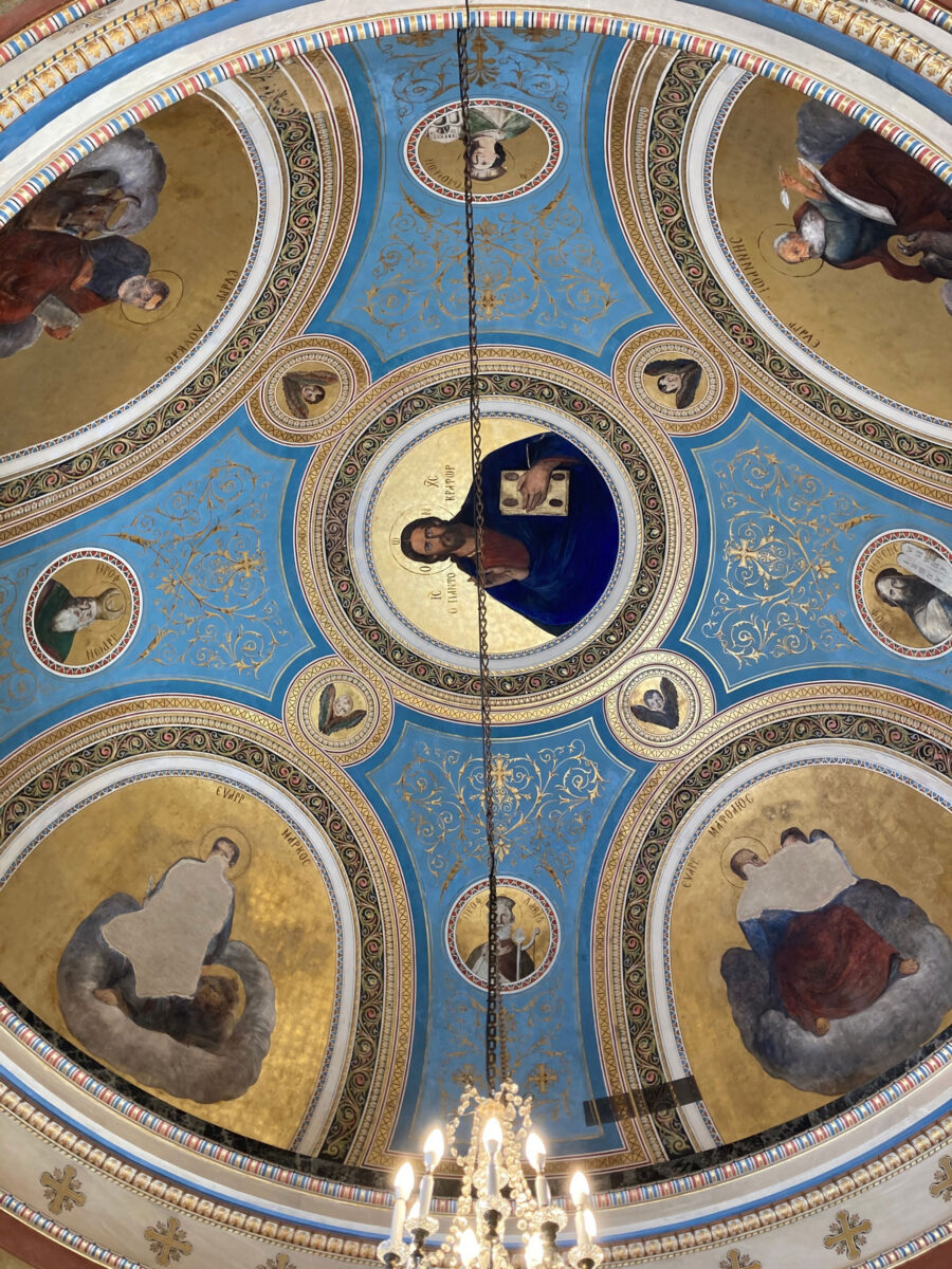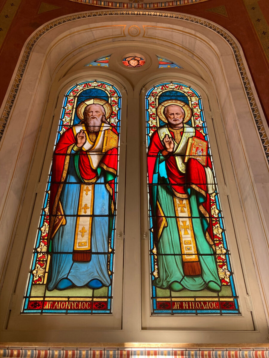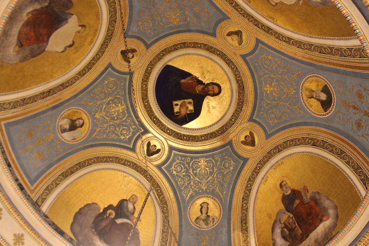 Ο ναός κτίστηκε σύμφωνα με σχέδια του αρχιτέκτονα Αναστασίου Μεταξά –και όχι του Τσίλερ όπως αποδίδονταν μέχρι πρόσφατα– και εγκαινιάστηκε στις 26 Μαρτίου 1895, παρουσία υψηλών προσκεκλημένων. Η εξωτερική επιφάνειά του διαμορφώνεται πλαστικά, με οριζόντιες παράλληλες ταινίες που διαχωρίζονται με σκοτίες και στην ανώτερη στάθμη διαμορφώνεται ζώνη με έκτυπα κυκλικά στοιχεία. Τα ανοίγματα του ναού πλαισιώνουν παραστάδες με γύψινα επίκρανα κορινθιακού τύπου, ενώ τα δύο αντιδιαμετρικά παράθυρα φέρουν αξιόλογες υαλογραφίες (βιτρώ), ρωσικού εργαστηρίου.